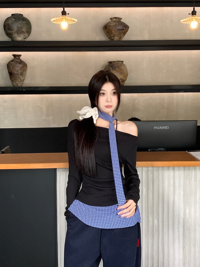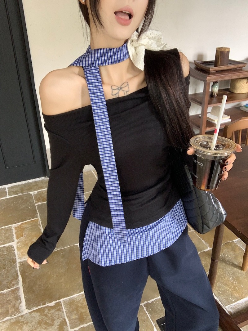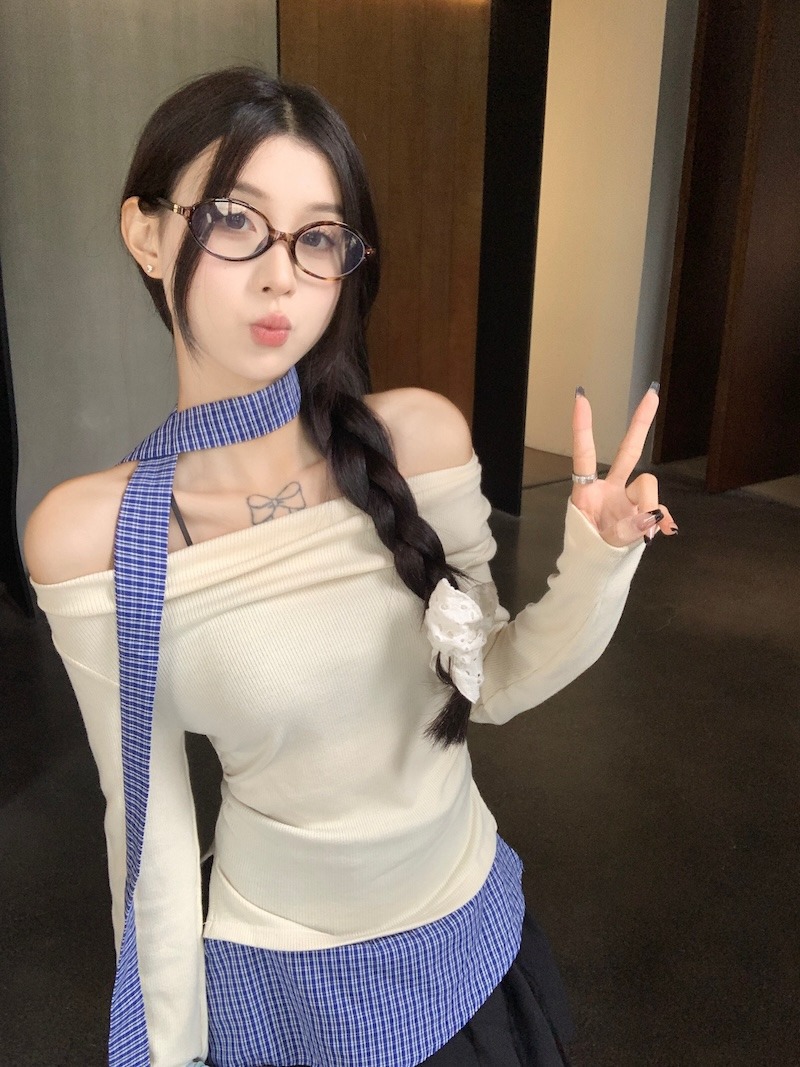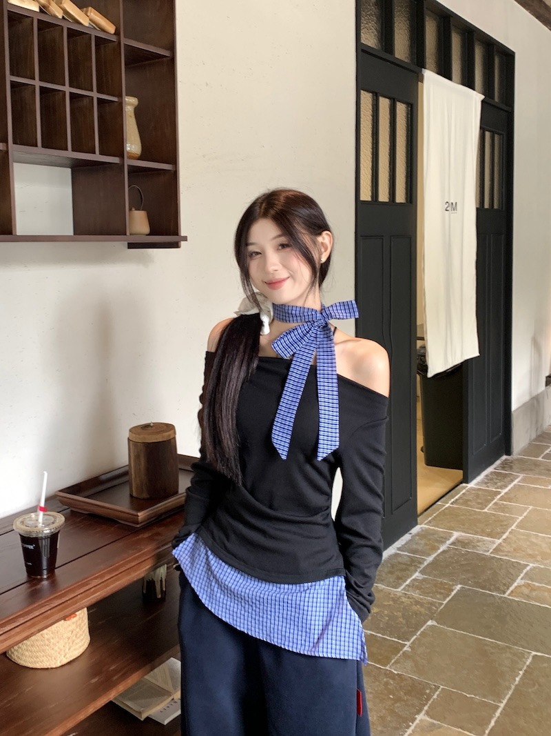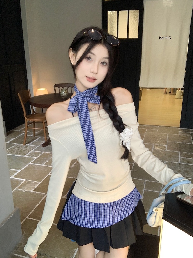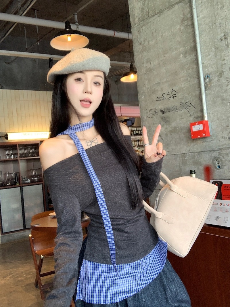 2025新款韩版修身显瘦设计感一字肩辣妹格子拼接长袖T恤打底衫女