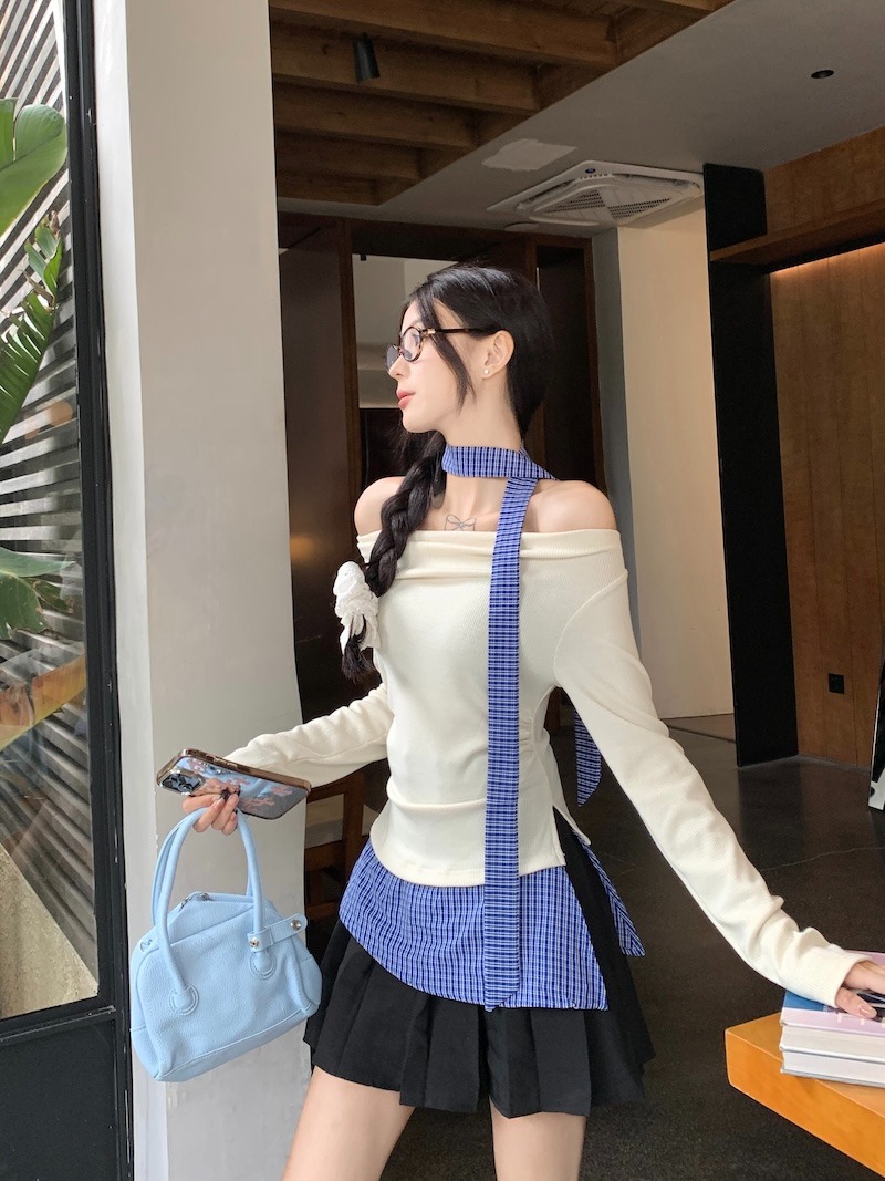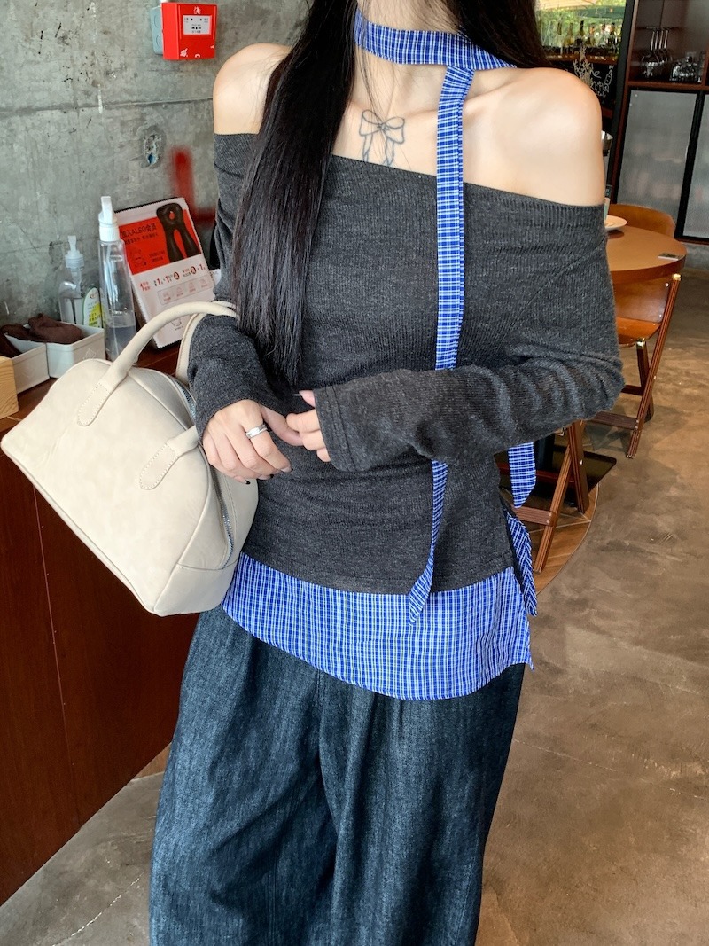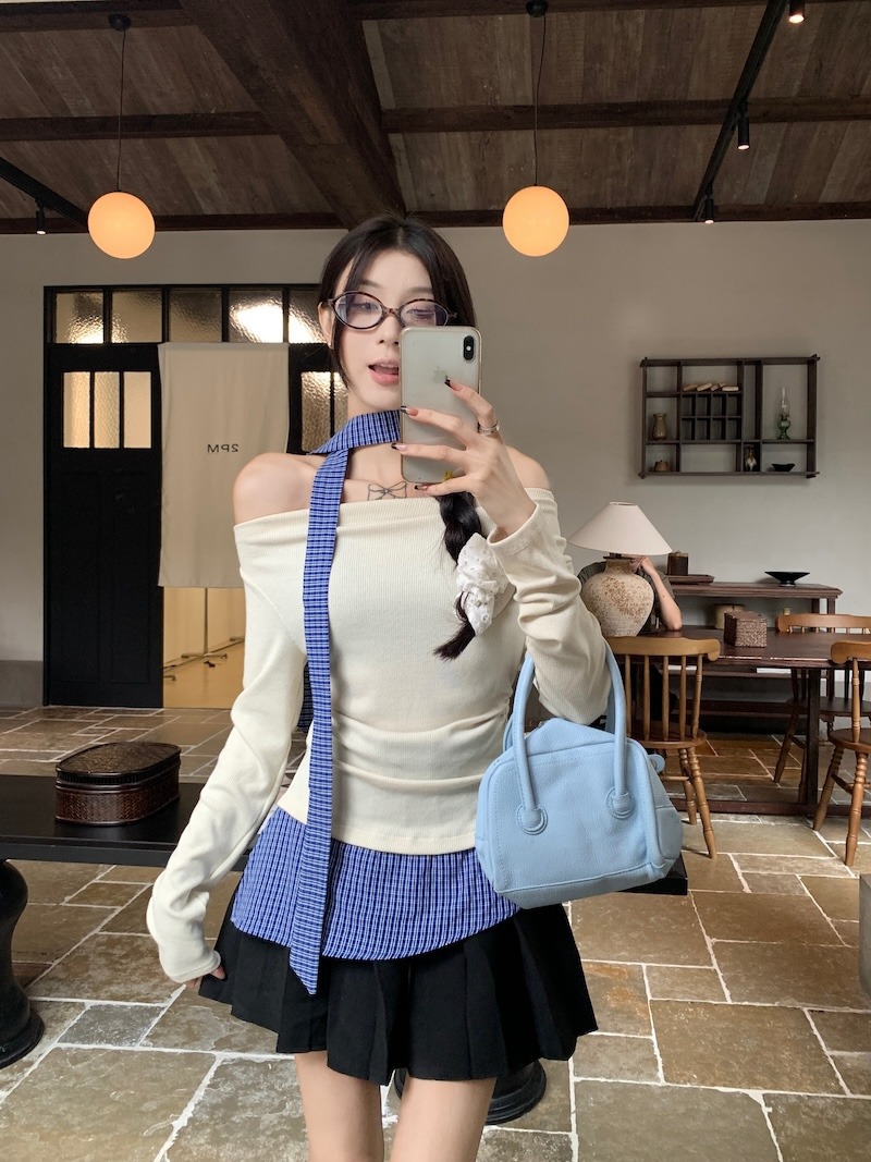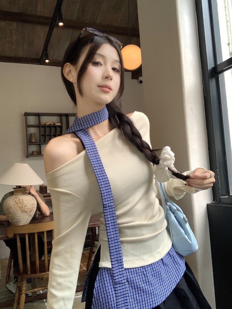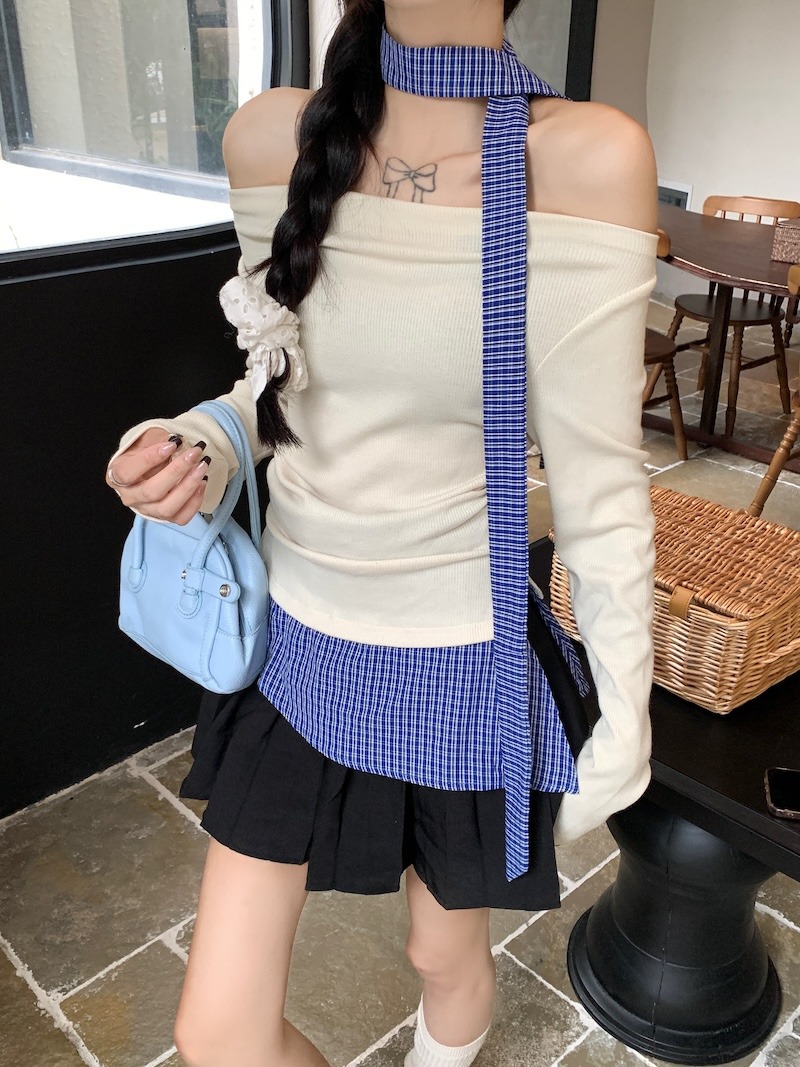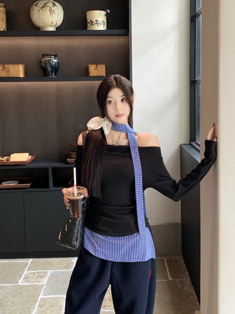 2025新款韩版修身显瘦设计感一字肩辣妹格子拼接长袖T恤打底衫女