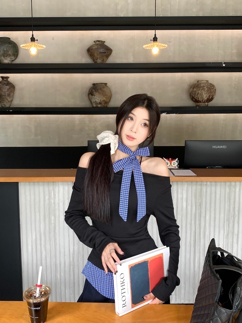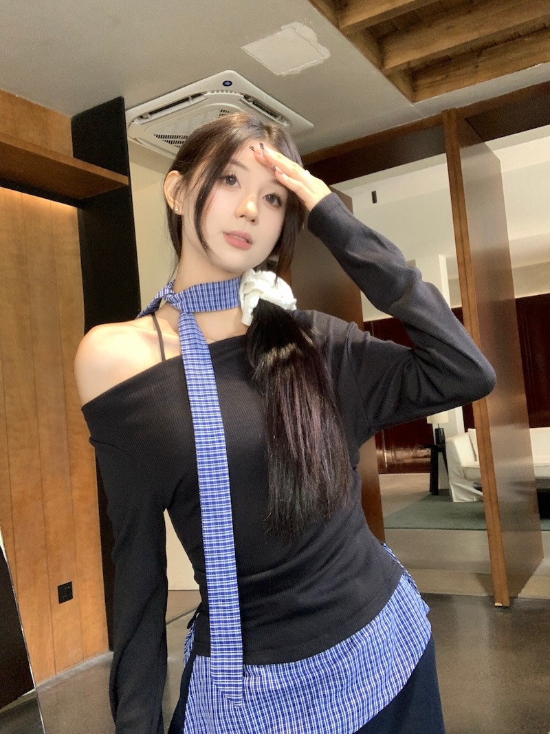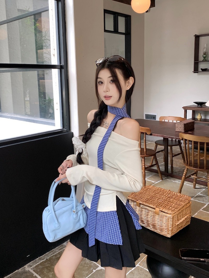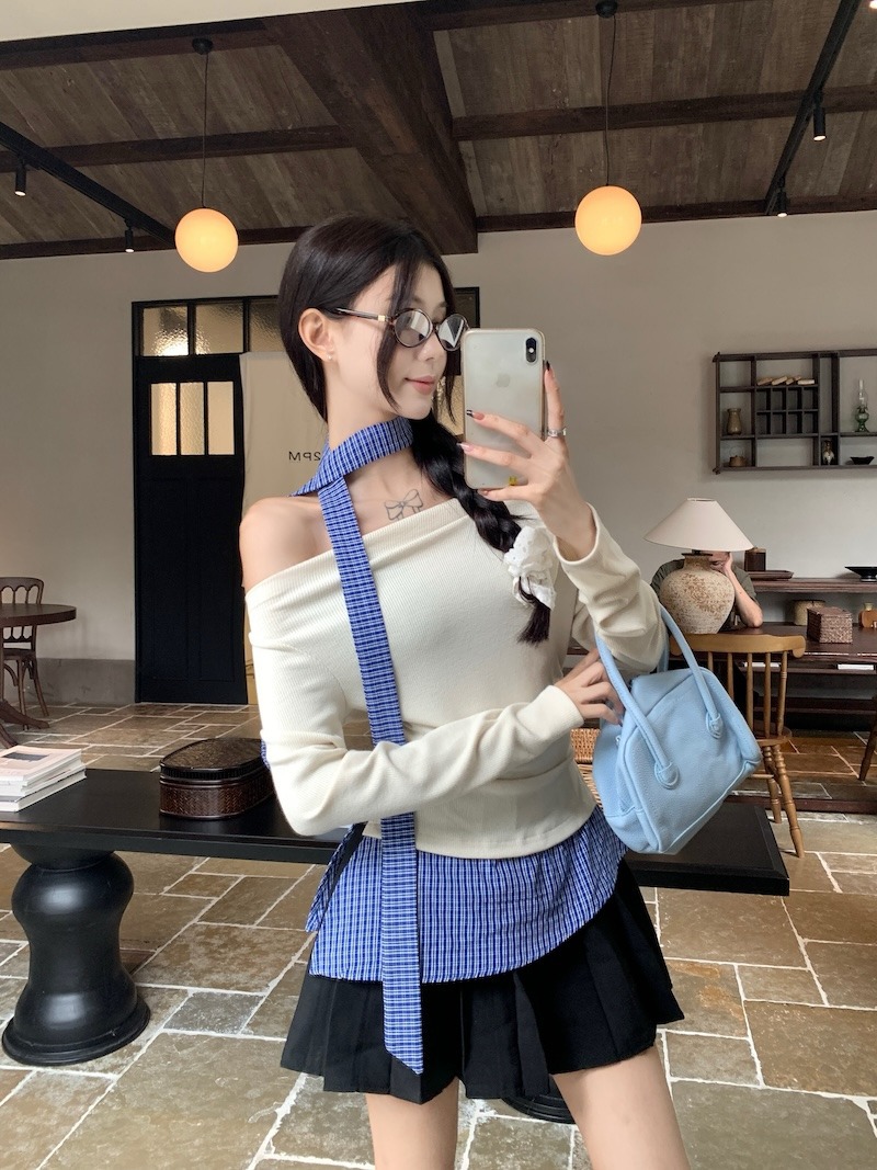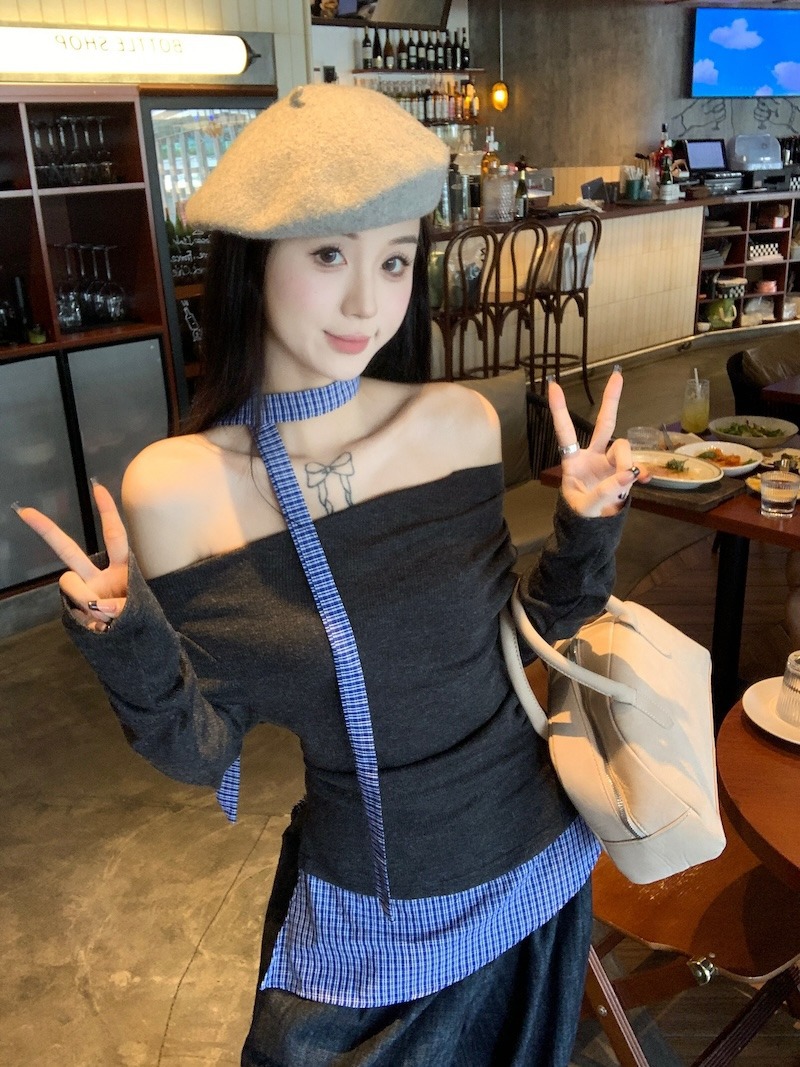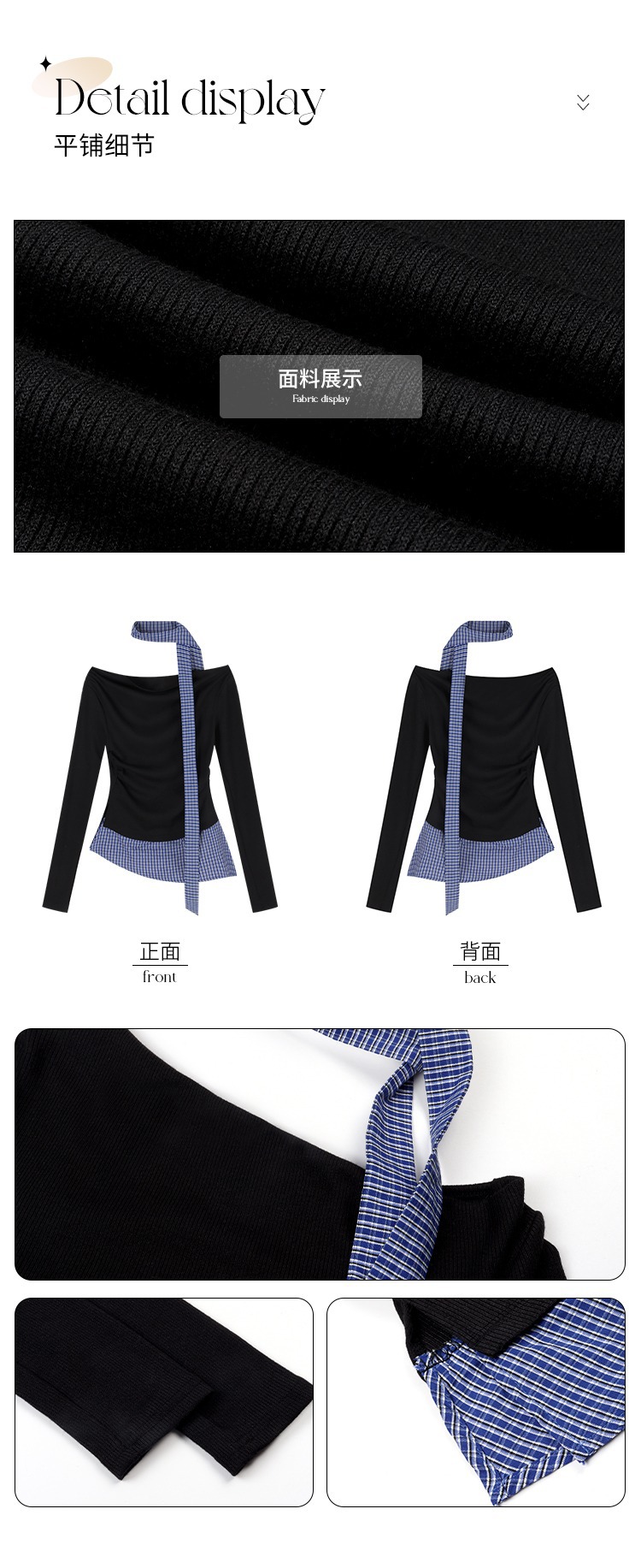 2025新款韩版修身显瘦设计感一字肩辣妹格子拼接长袖T恤打底衫女