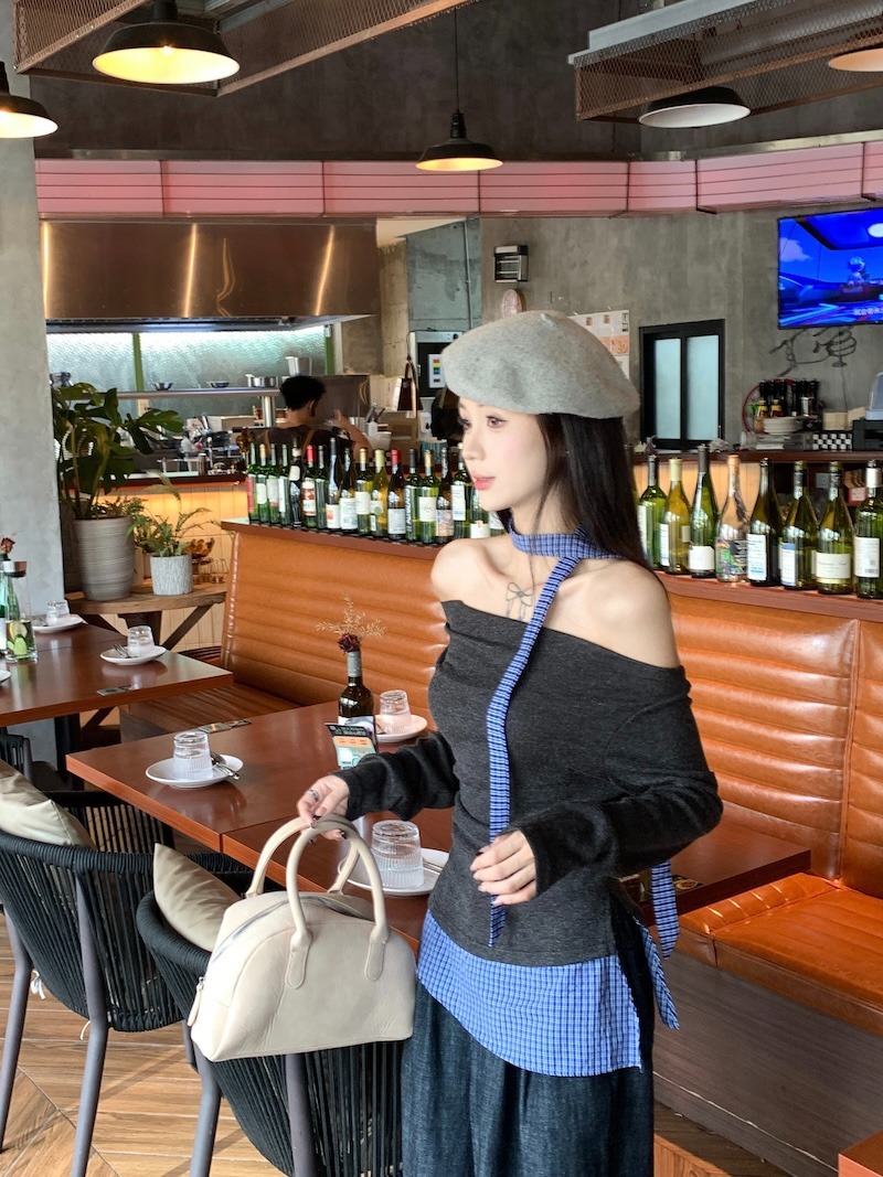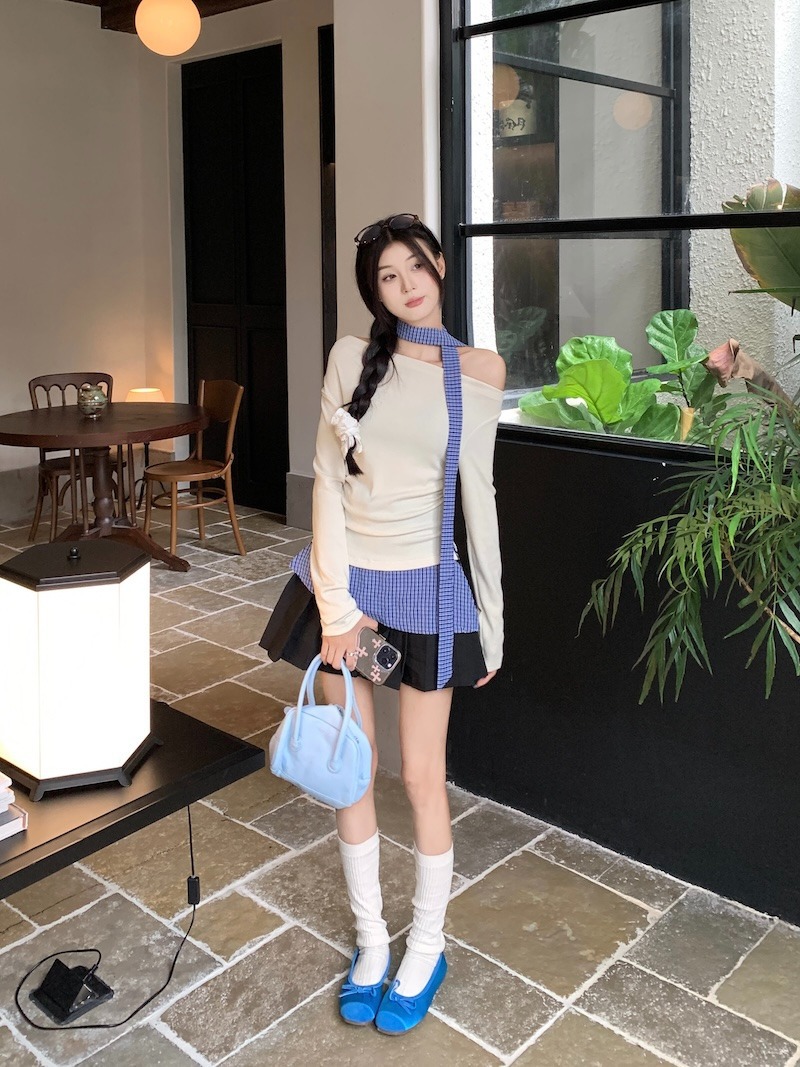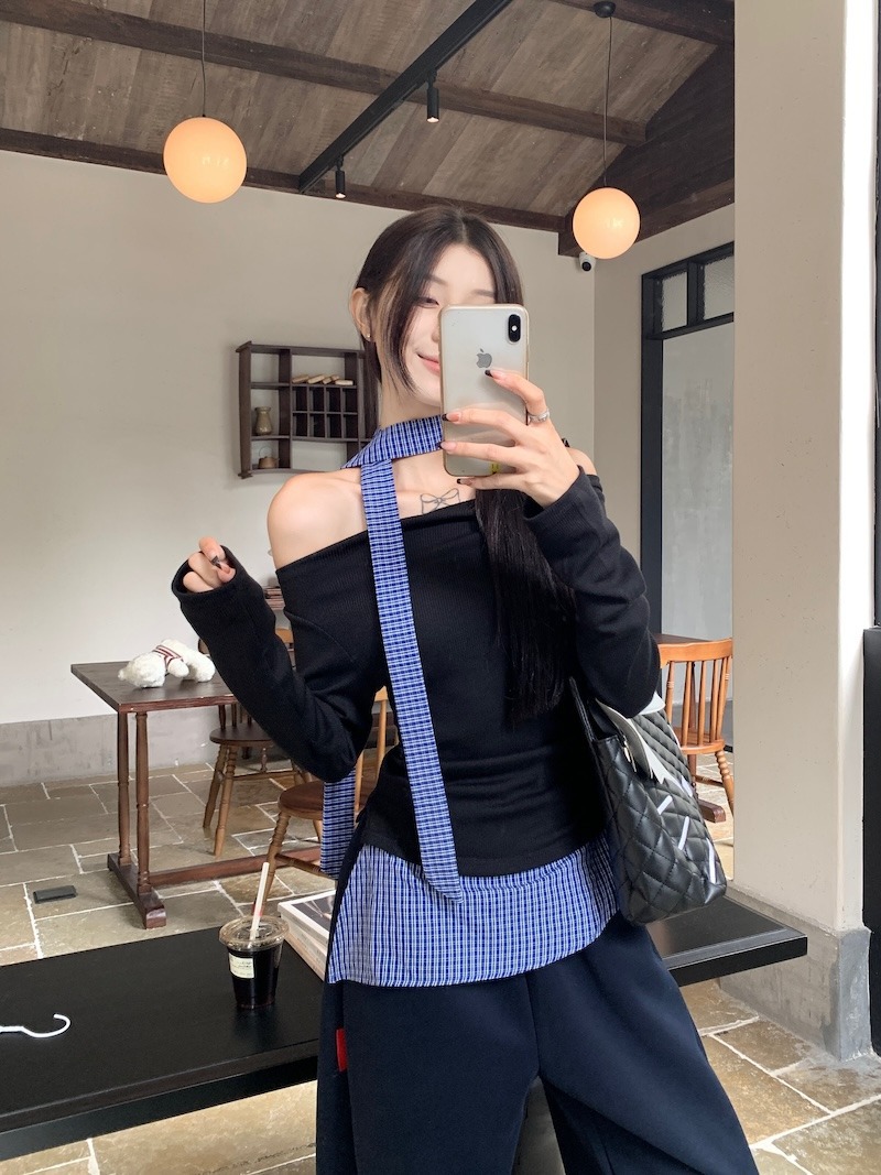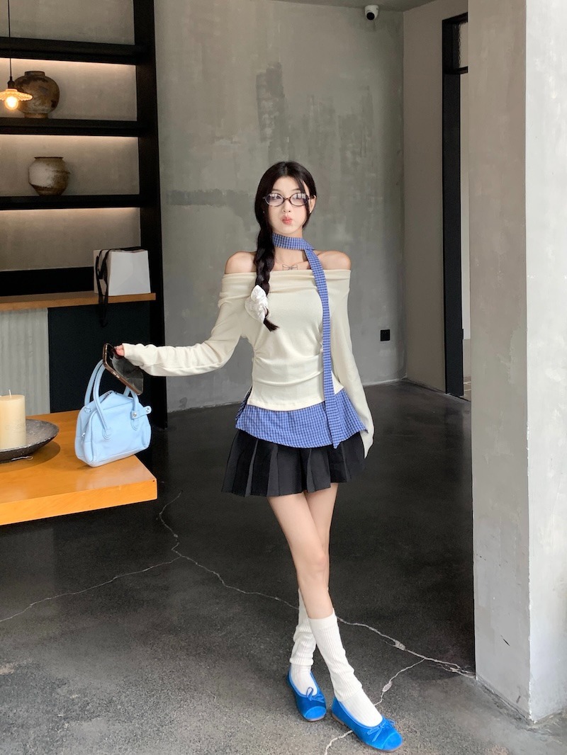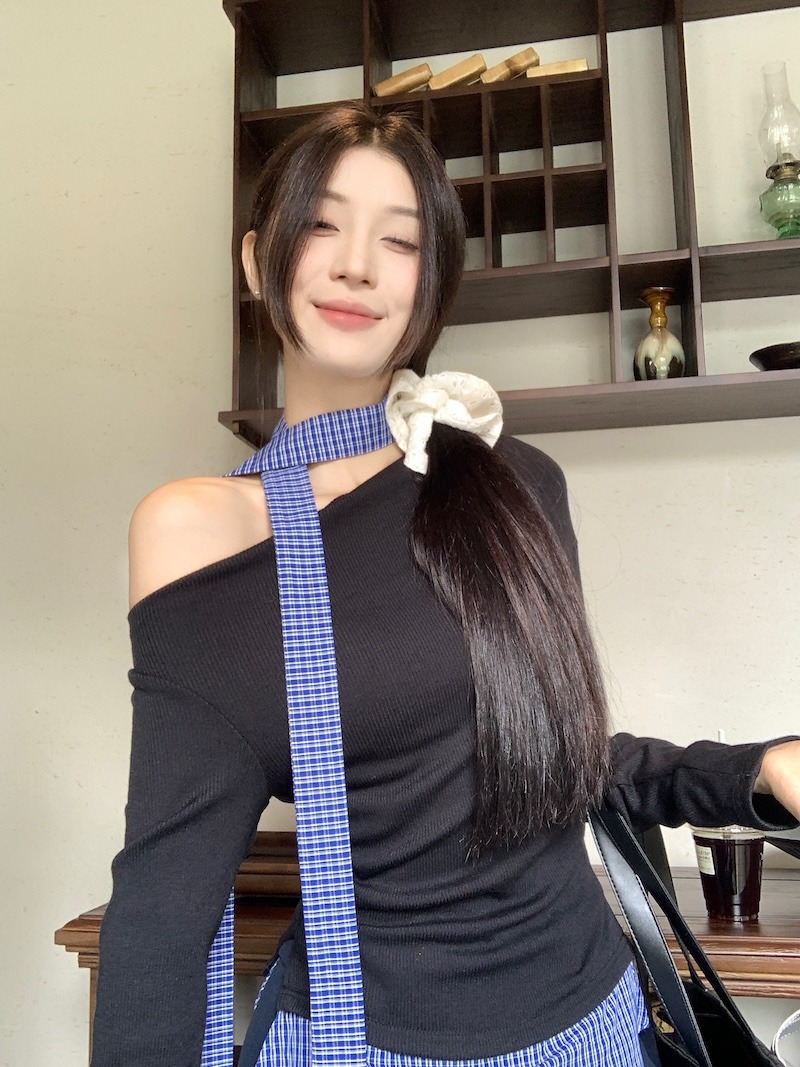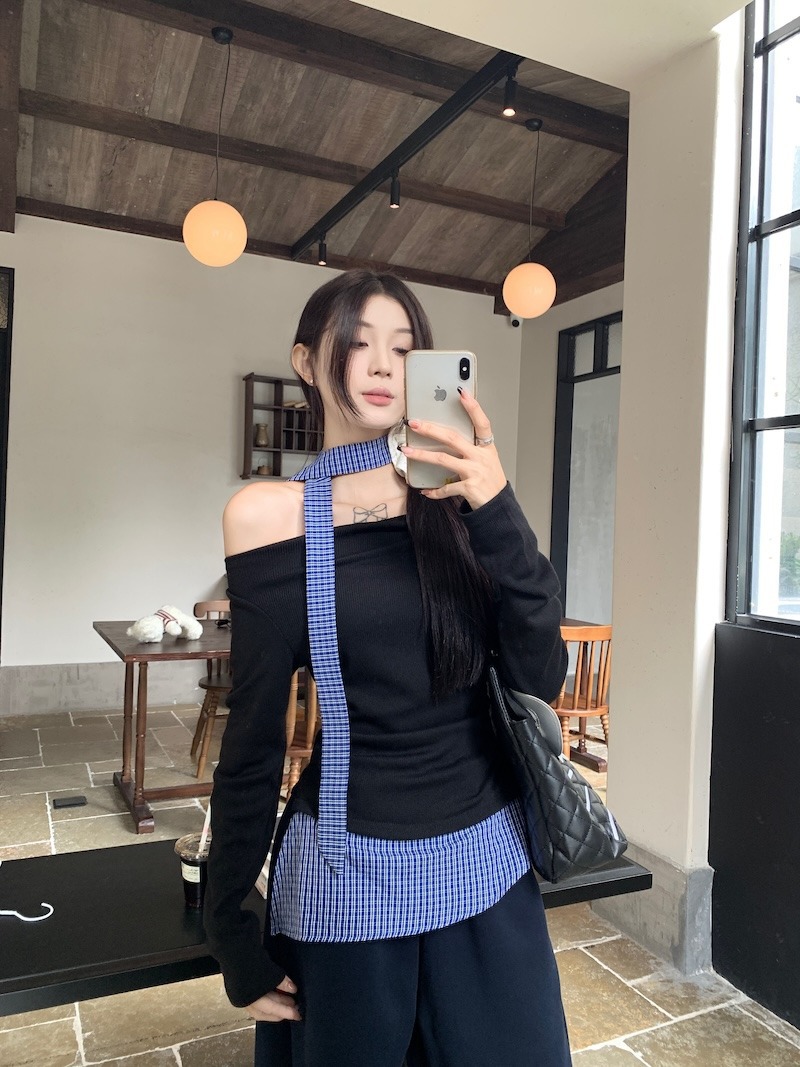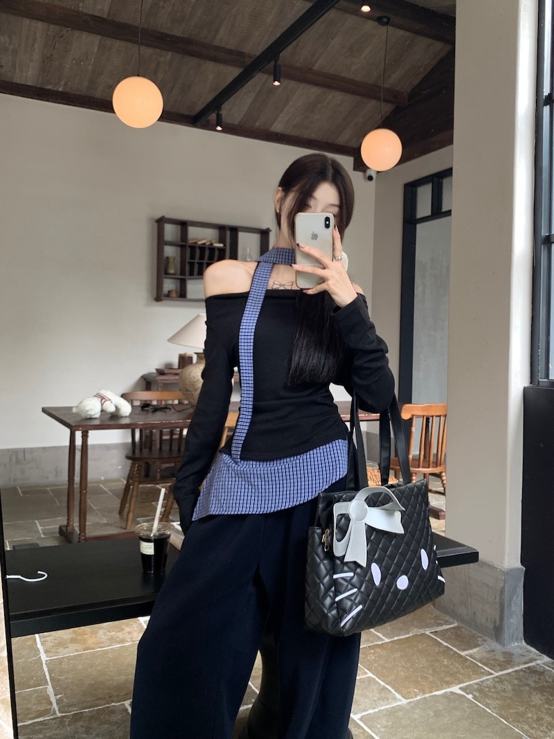 2025新款韩版修身显瘦设计感一字肩辣妹格子拼接长袖T恤打底衫女