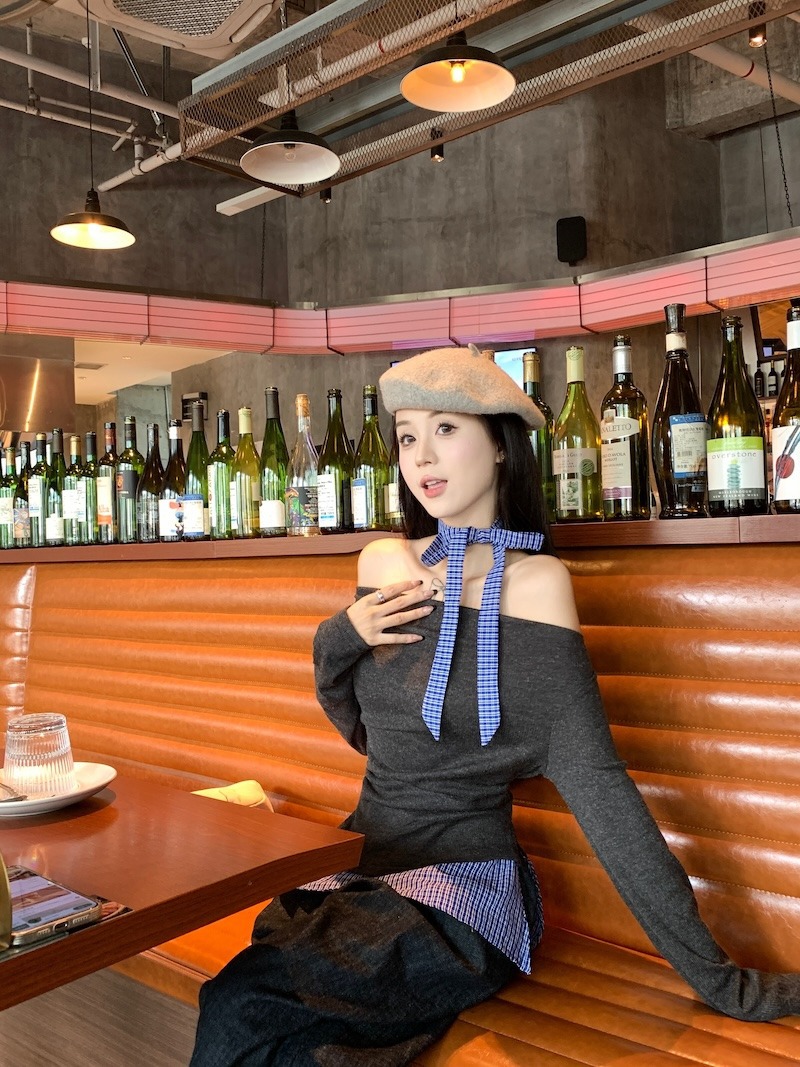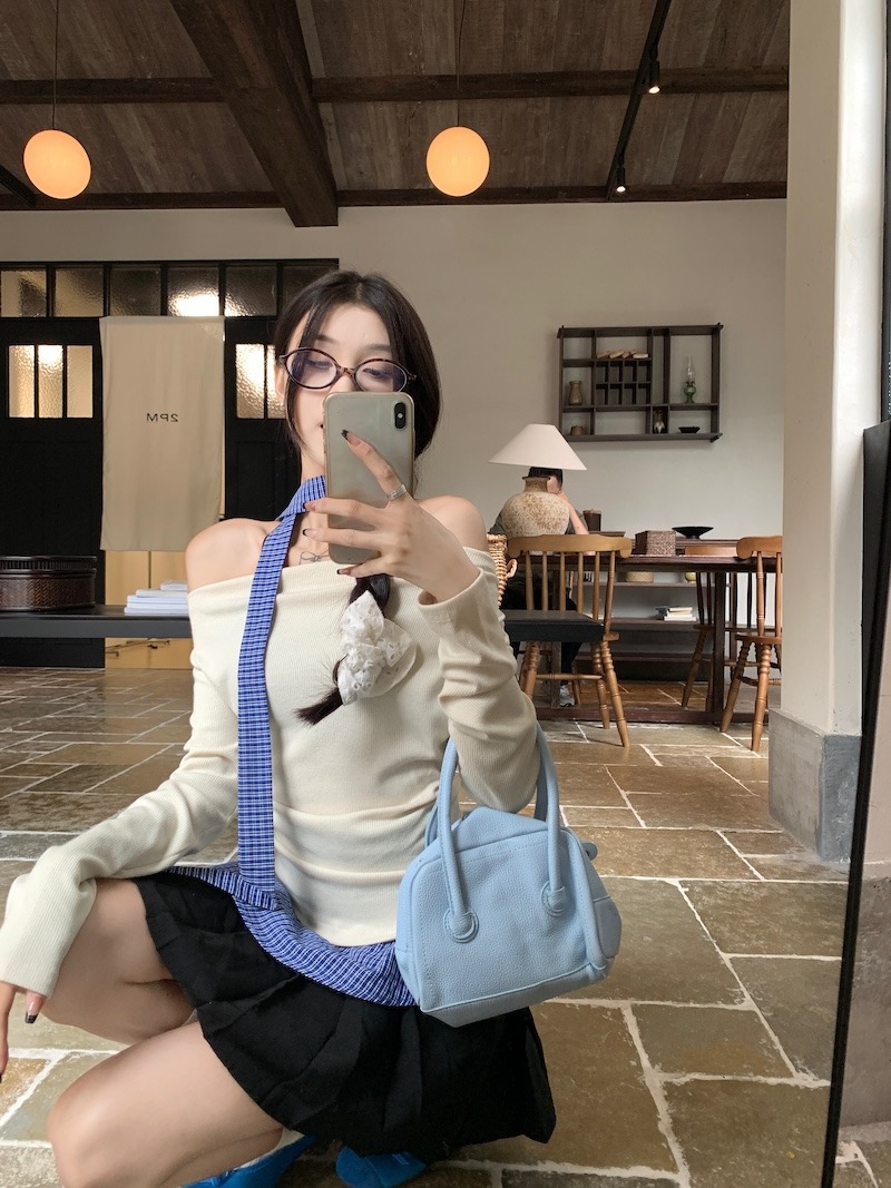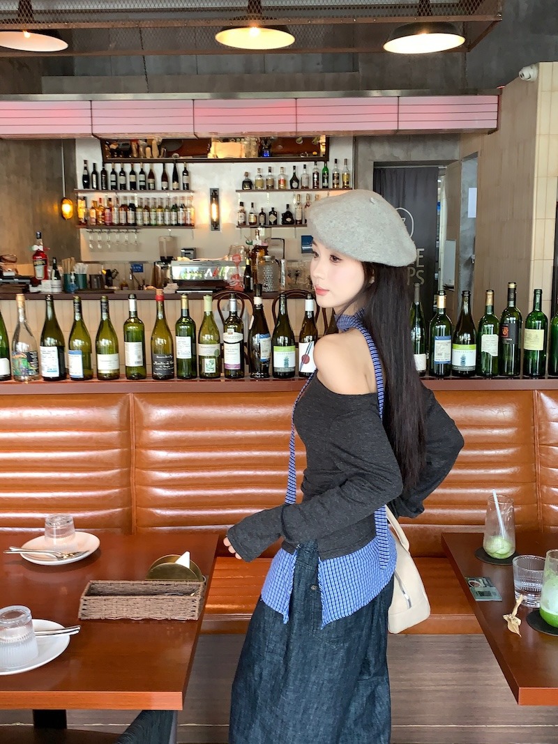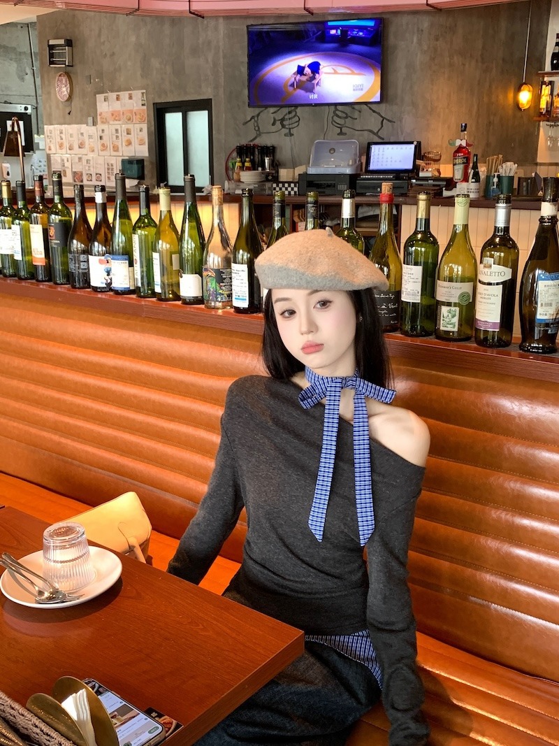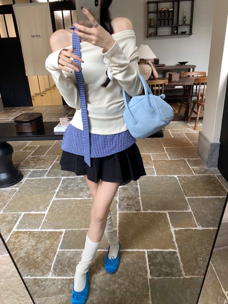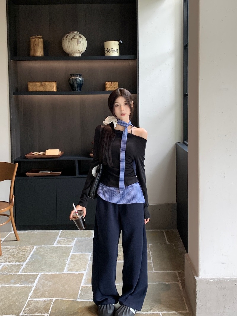 2025新款韩版修身显瘦设计感一字肩辣妹格子拼接长袖T恤打底衫女