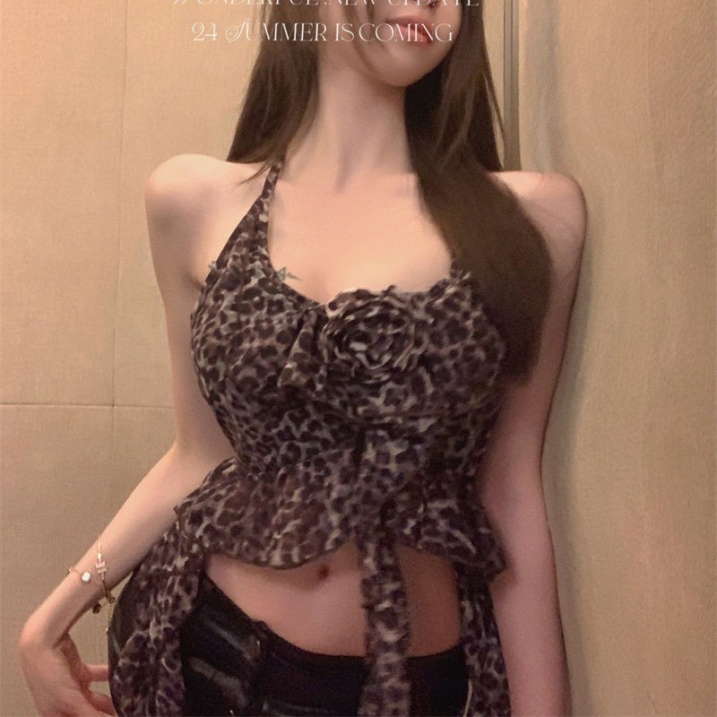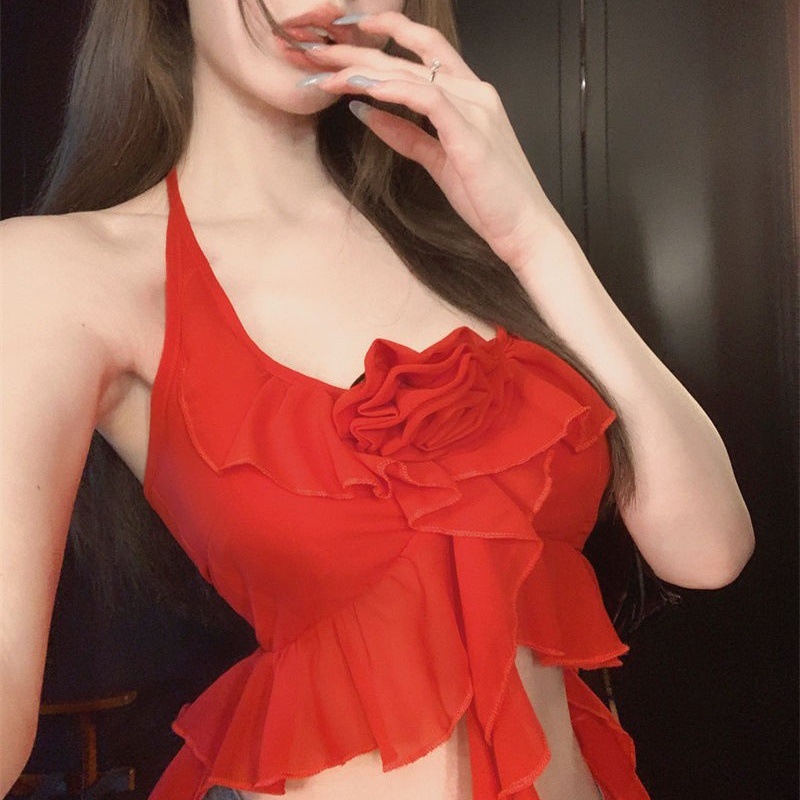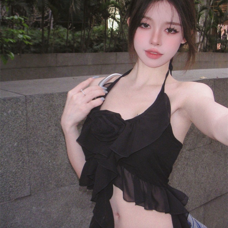 性感荷叶边短款小吊带背心女夏黑色辣妹紧身挂脖抹胸上衣露脐内搭