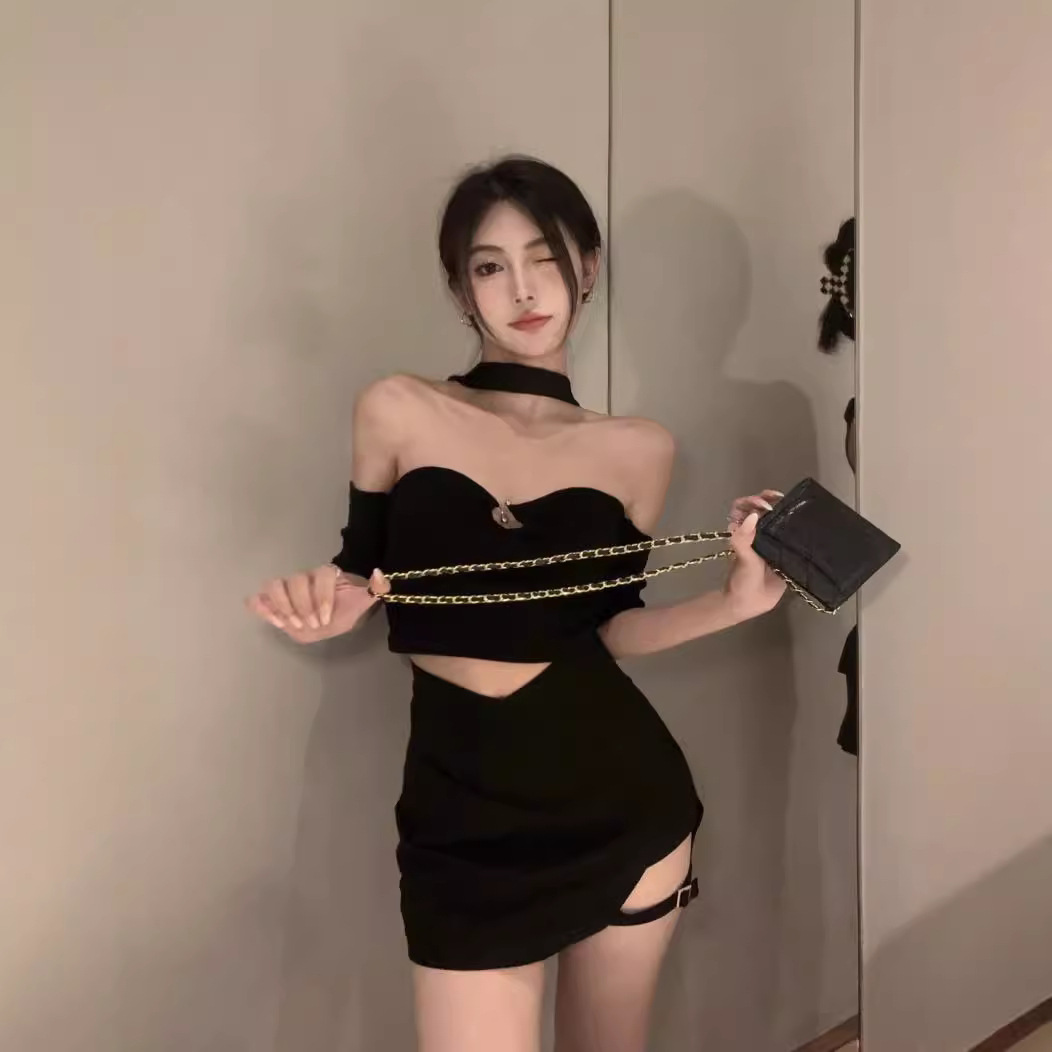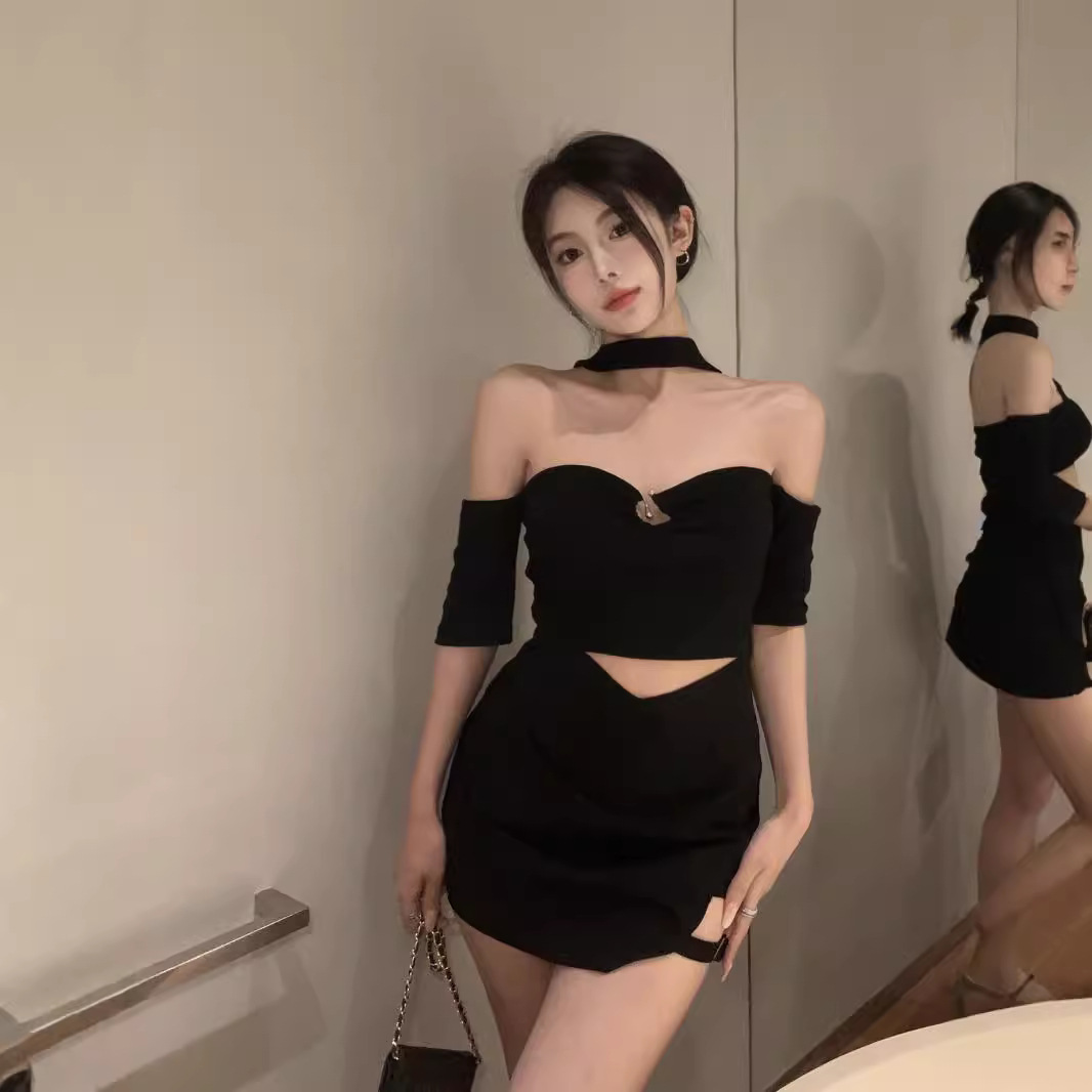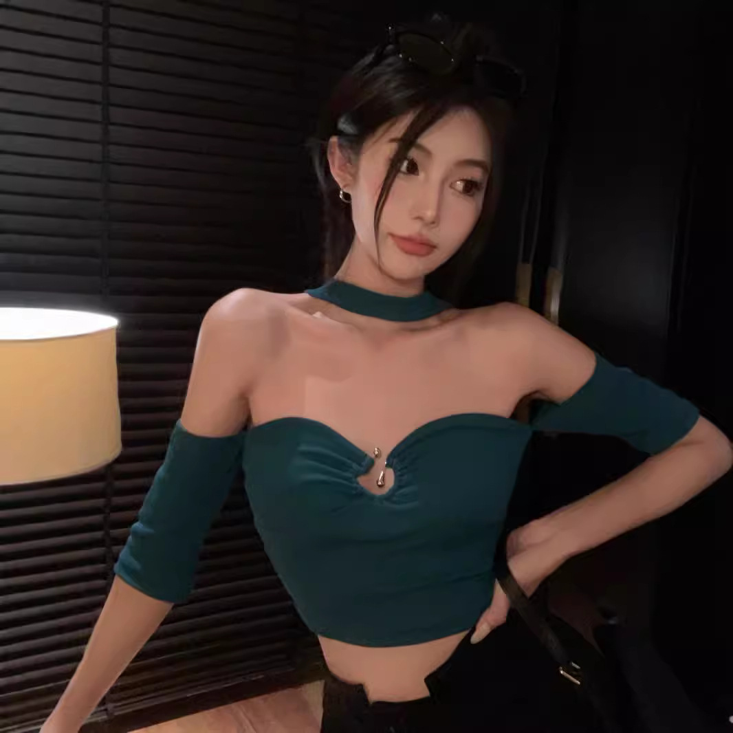 美式辣妹性感露肩一字肩挂脖短袖T恤女夏季设计感显瘦短款上衣