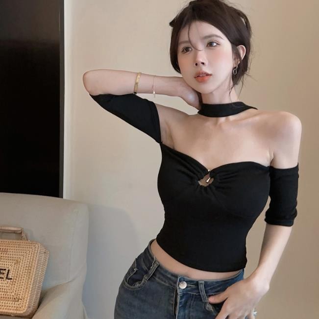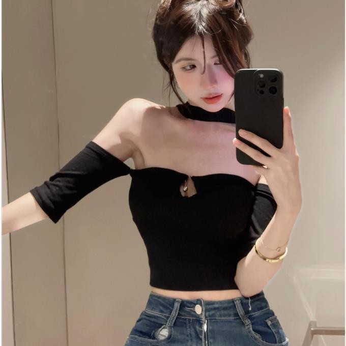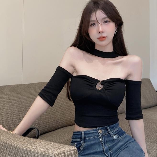 显瘦挂脖抹胸短袖t恤女名媛纯欲风辣妹风一字肩露背短款女上衣潮