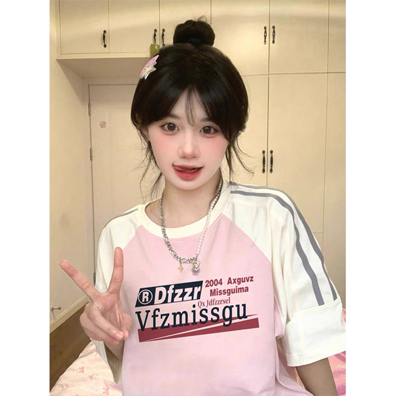 国潮纯棉插肩袖字母印花短袖粉色T恤女夏小众撞色设计感宽松上衣