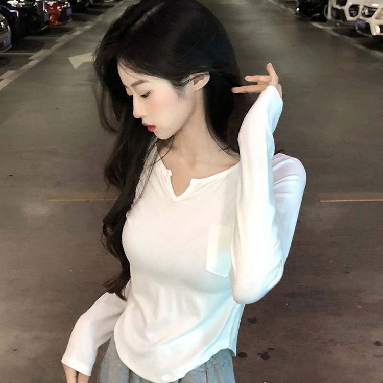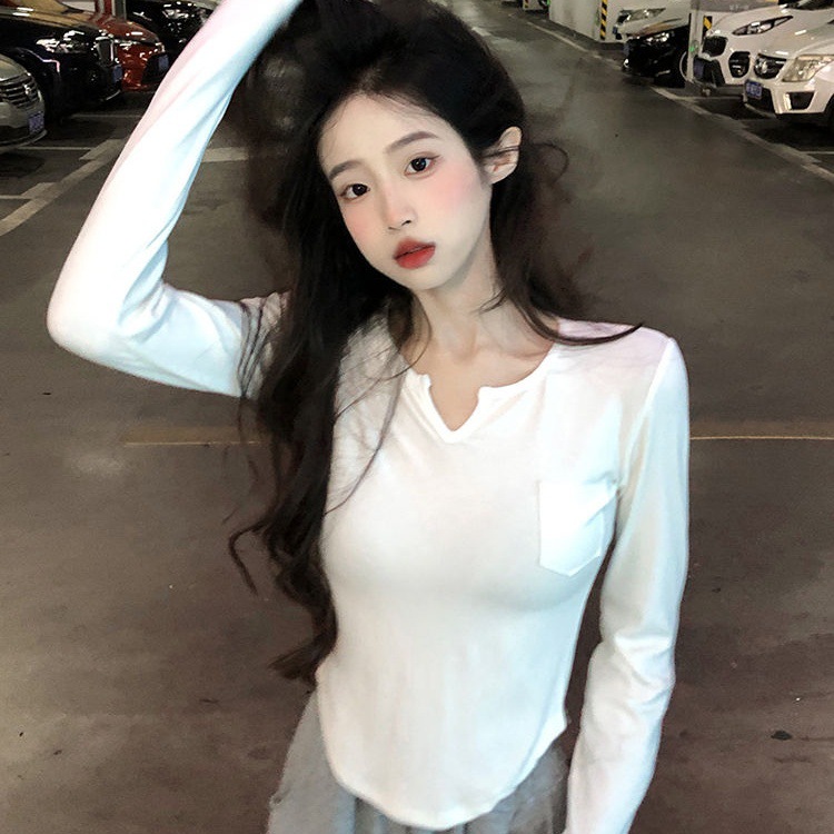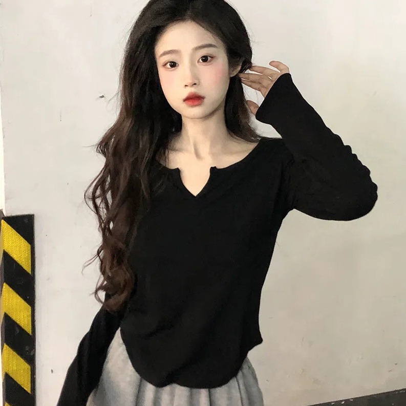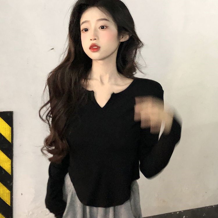 纯棉V领短款长袖T恤女韩版小众不规则上衣辣妹修身显瘦百搭打底衫