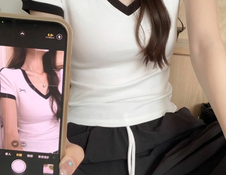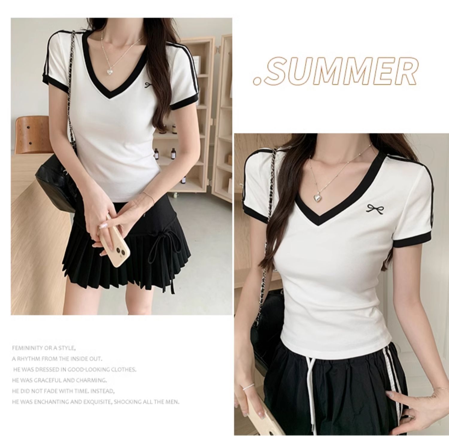 纯棉短袖T恤女夏季新款爆款正肩白色修身短款设计感v领欧货上衣潮