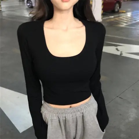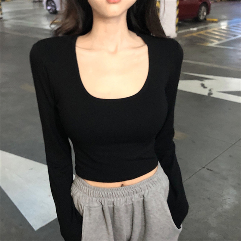 纯棉大U领甜辣正肩短款t恤女显瘦长袖秋季2025新款设计感小众上衣