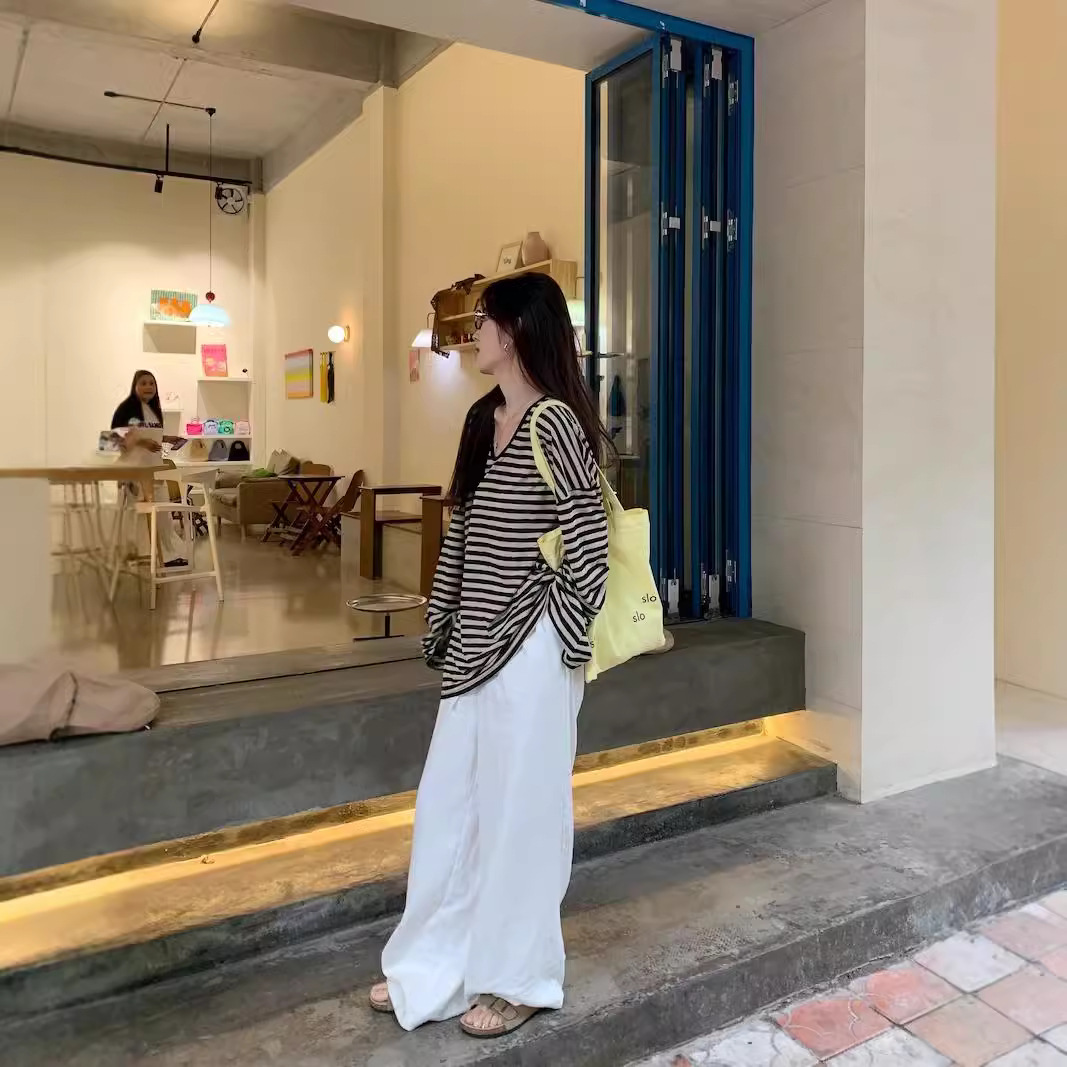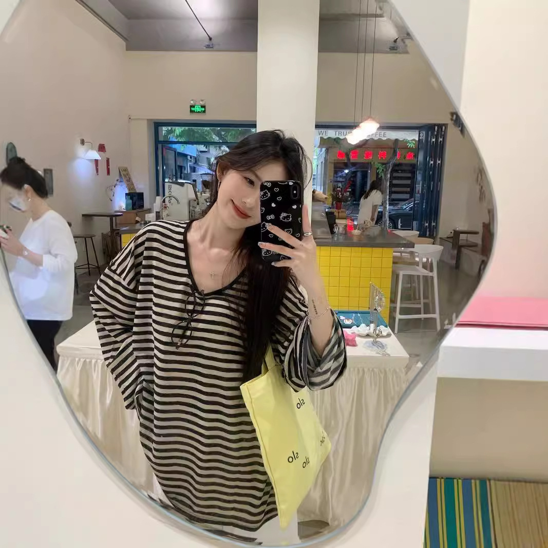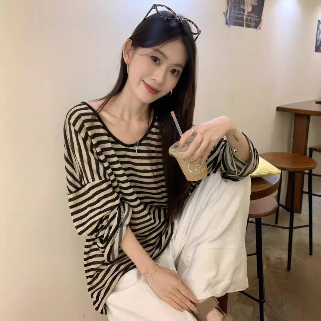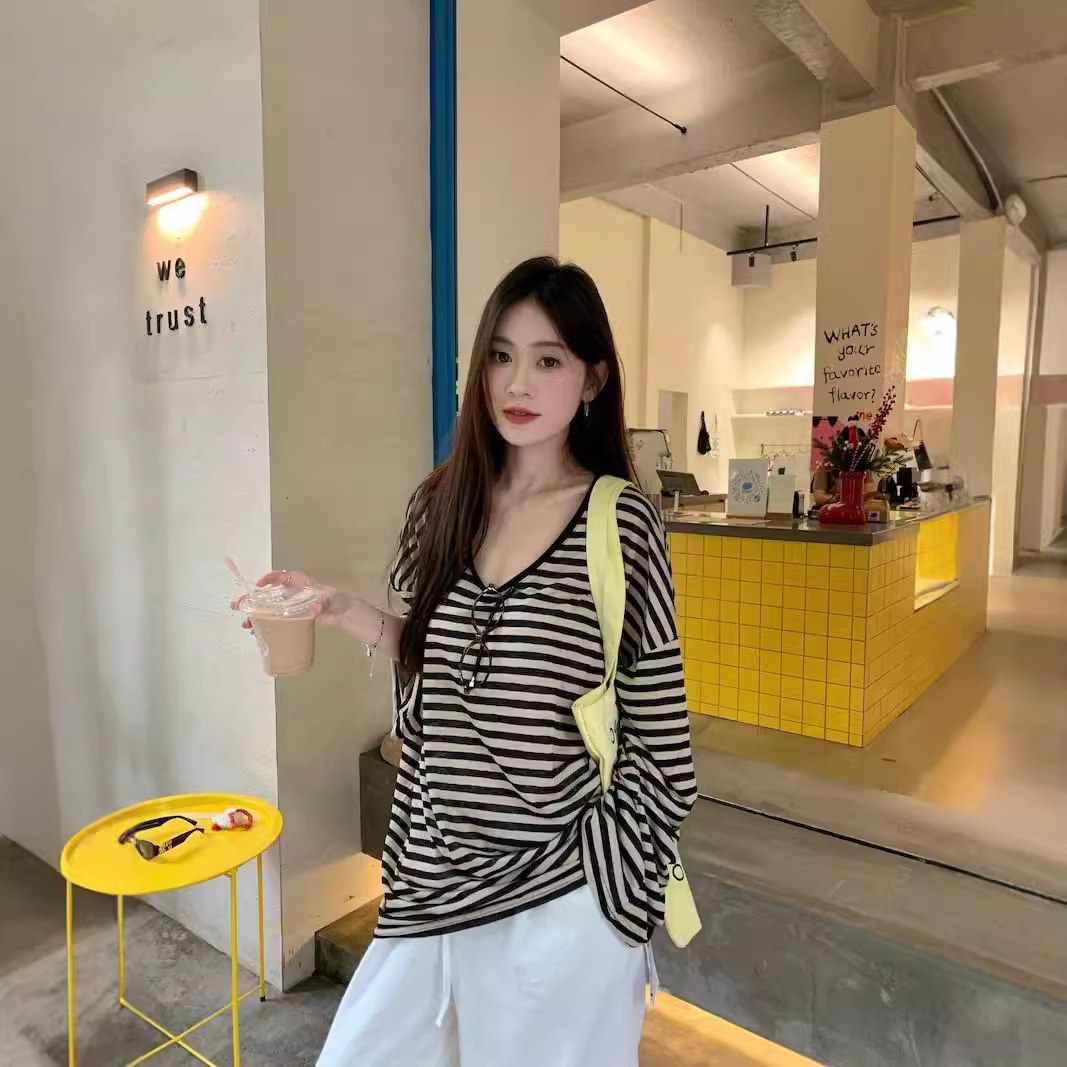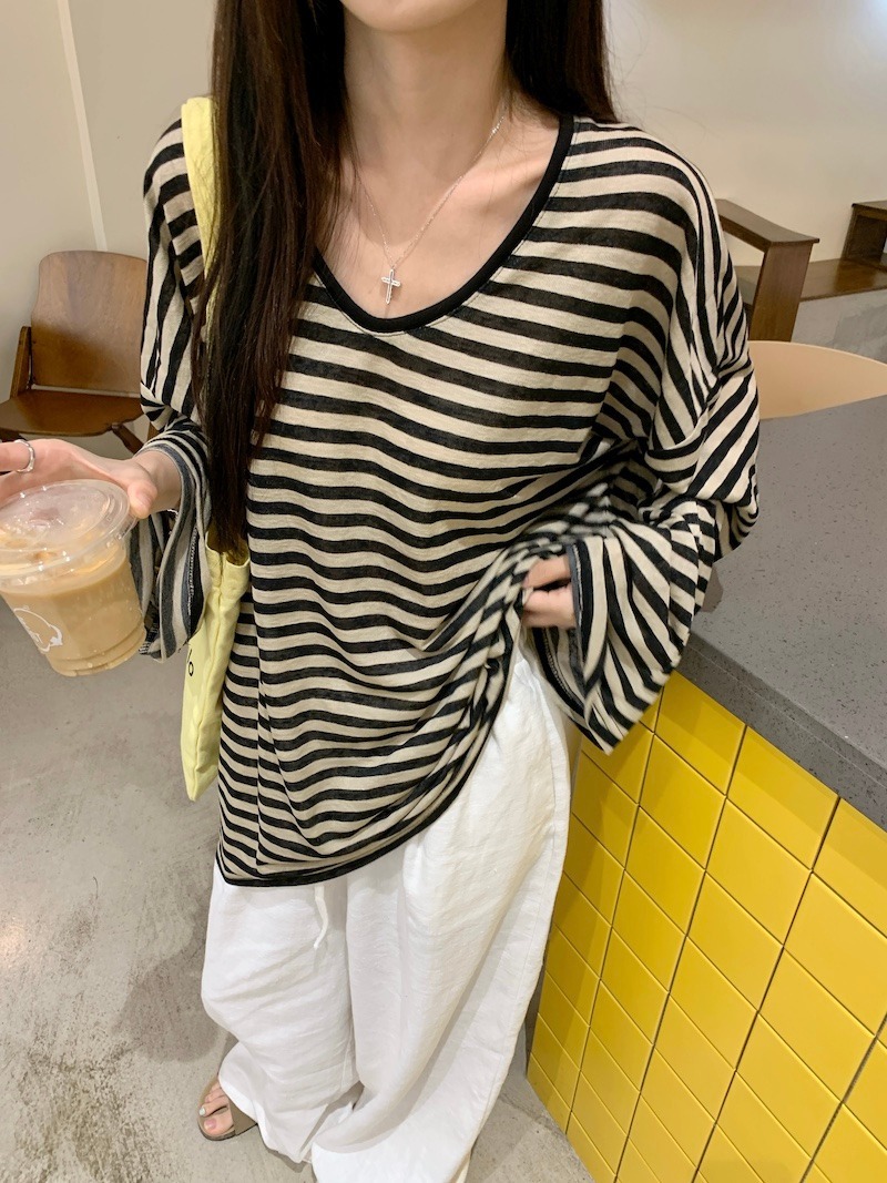 螺纹条纹防晒罩衫慵懒风V领宽松薄款上衣宽松t恤女薄款长袖设计感