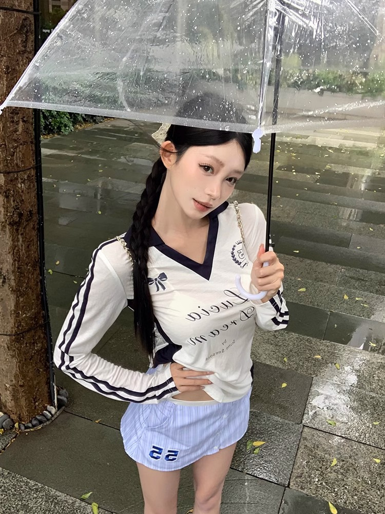 纯欲甜辣妹风三条杠撞色长袖T恤女2025新款爆款秋季修身欧货上衣