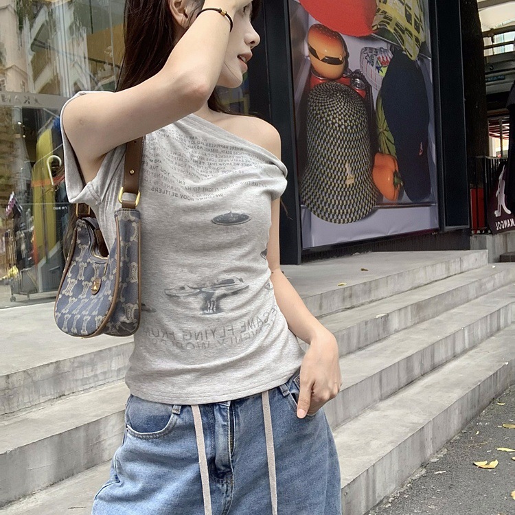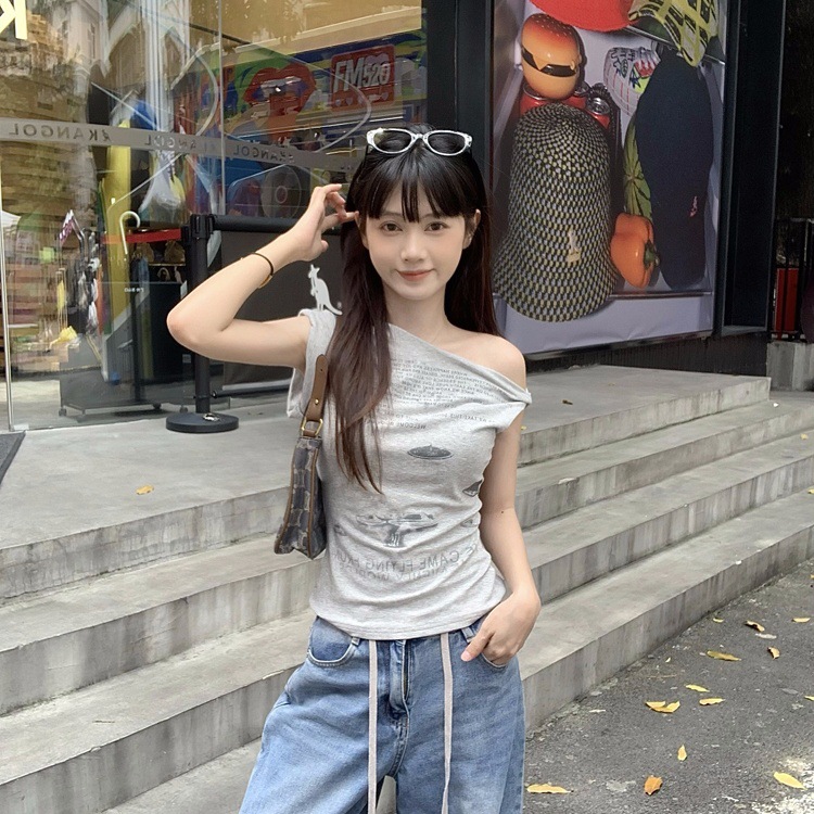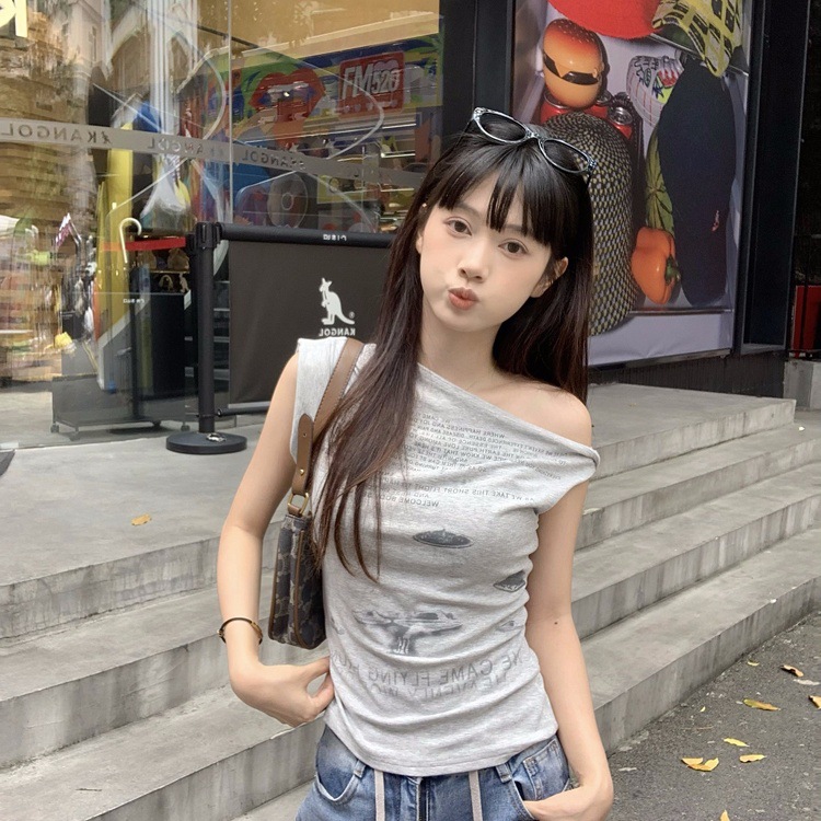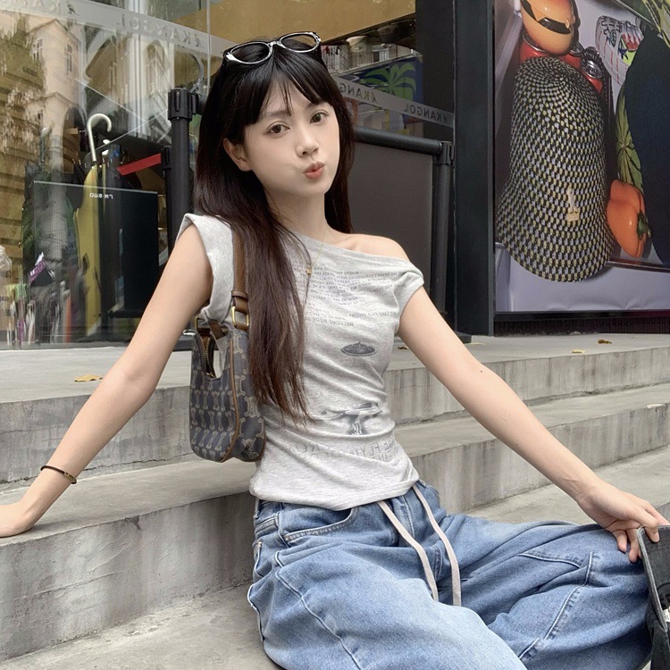 纯棉褶皱斜肩短袖t恤女夏季显瘦设计感名媛气质百搭上衣辣妹欧美
