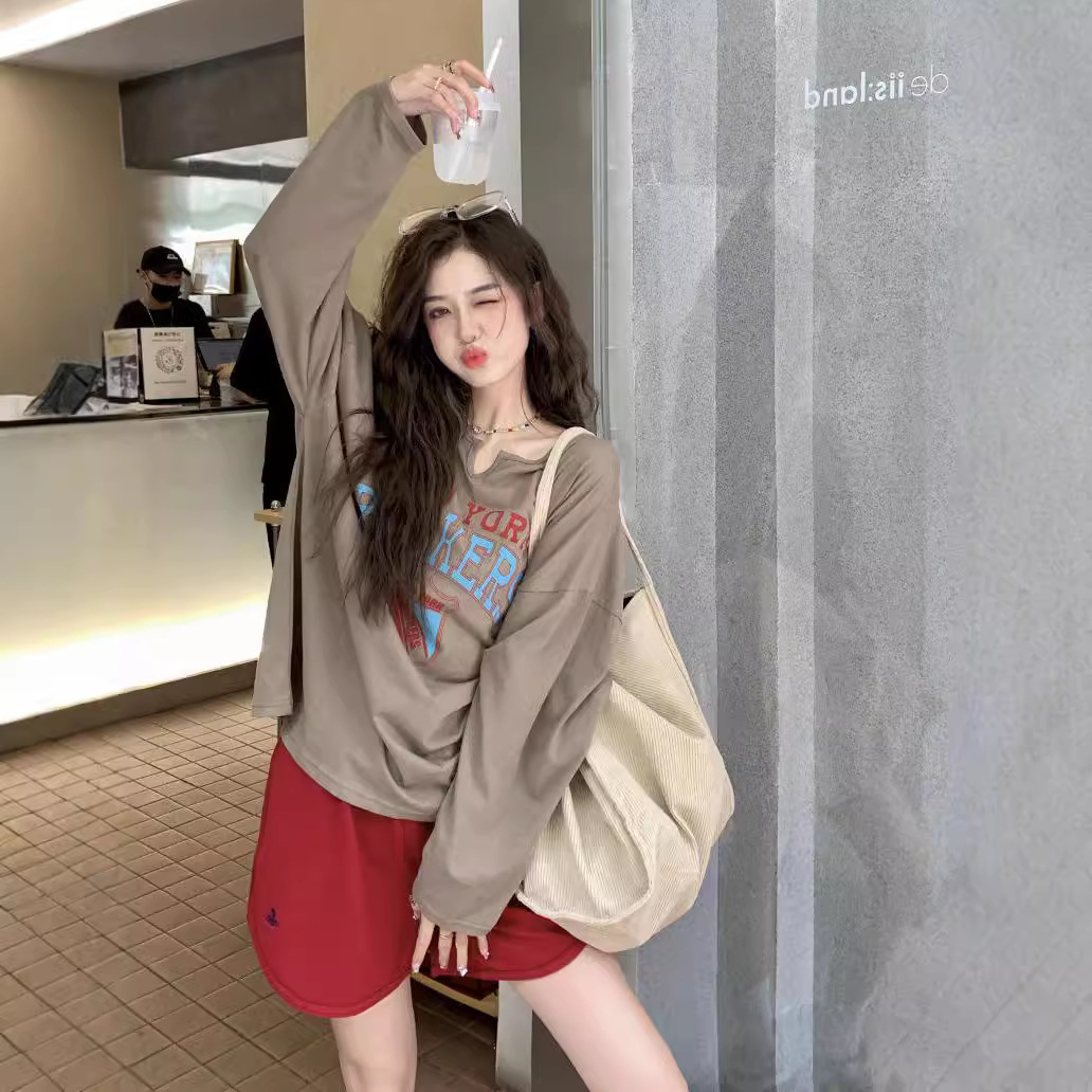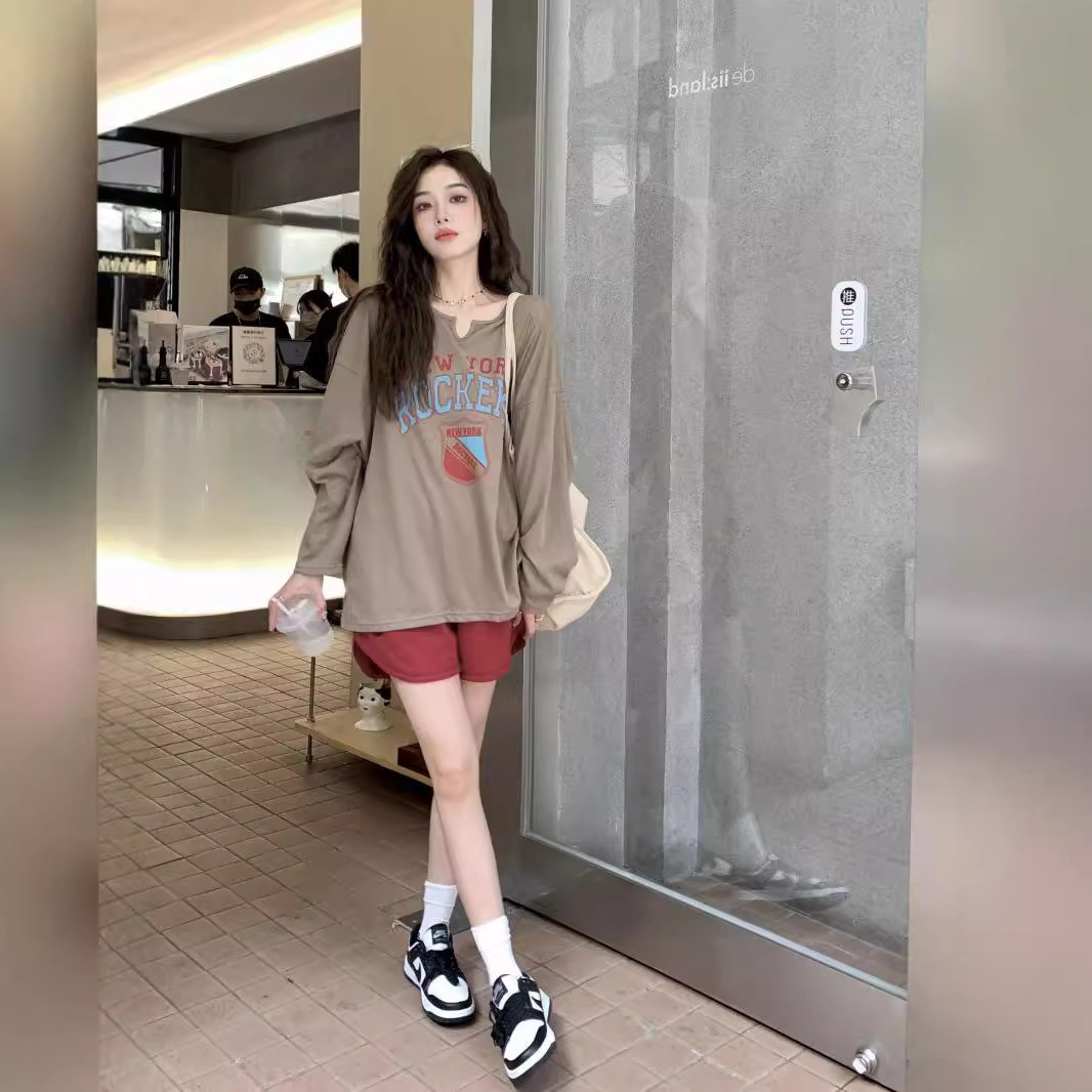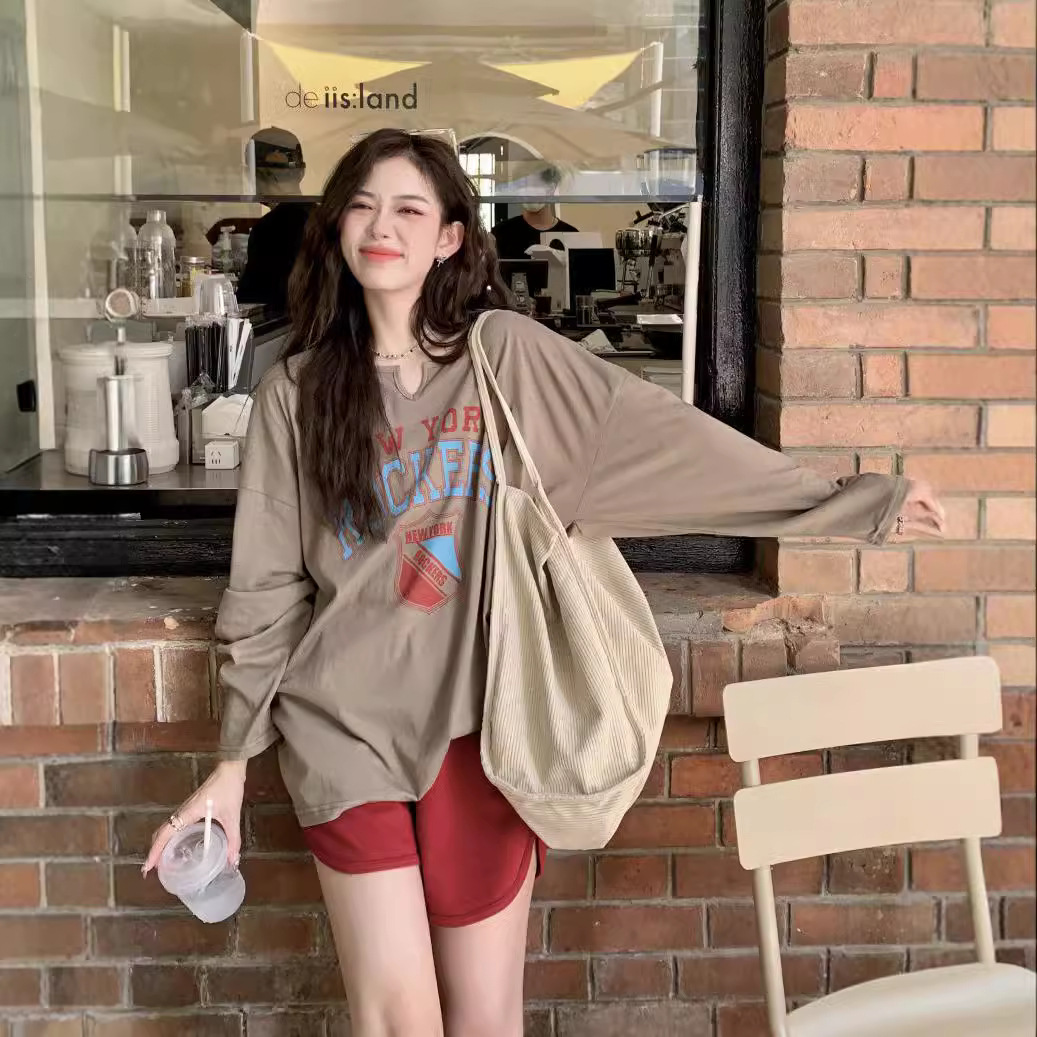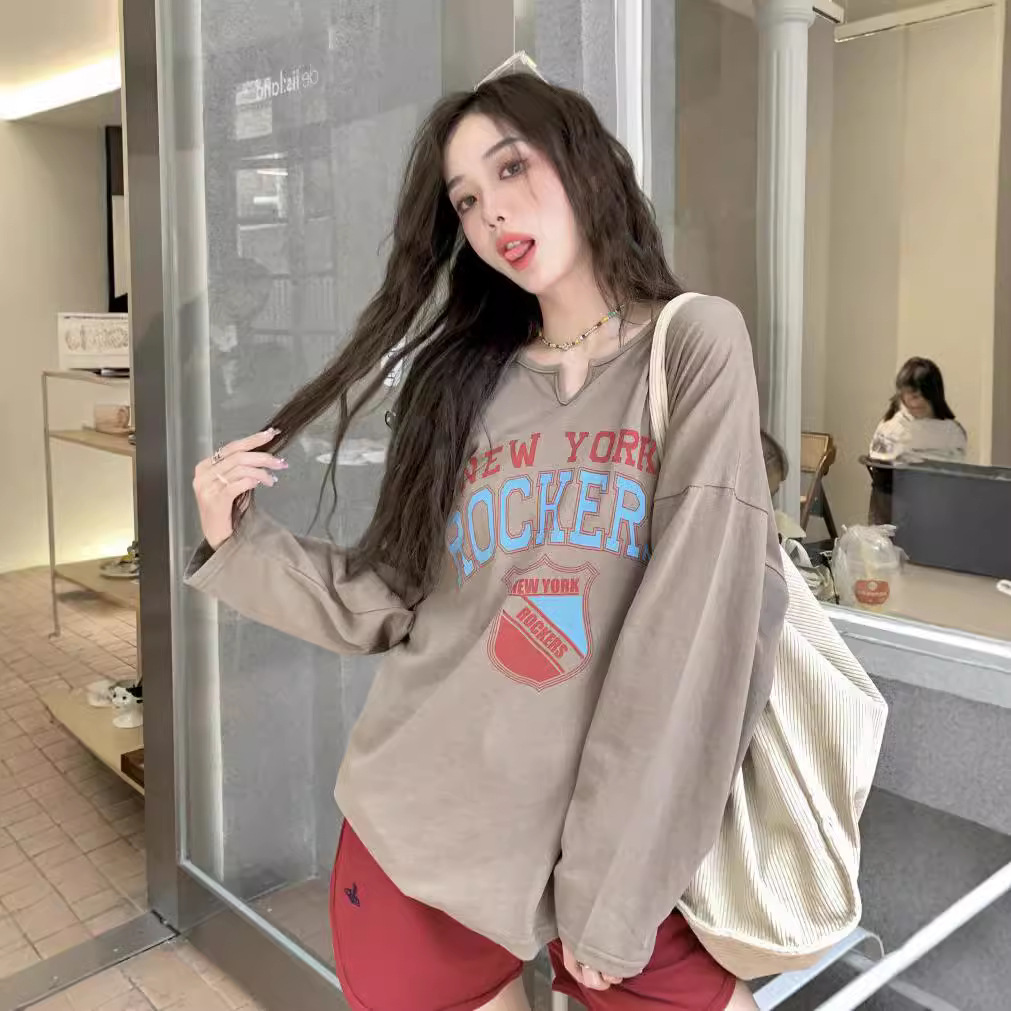 半开领纯棉休闲印花长袖设计感T恤女春秋2025新款慵懒薄款ins上衣
