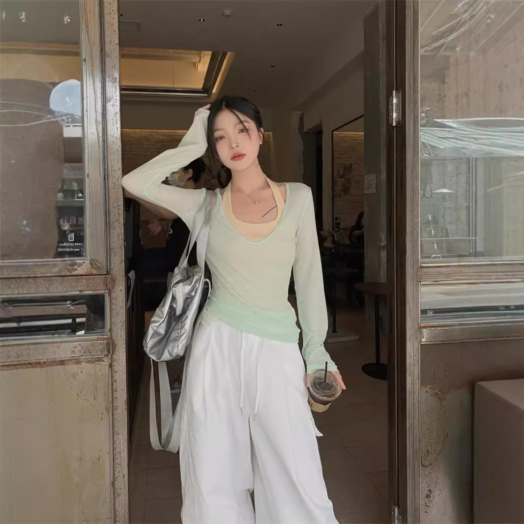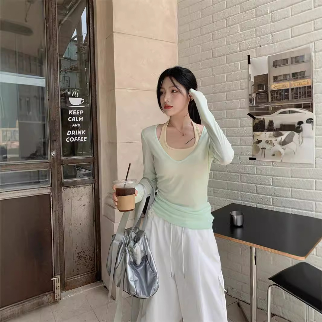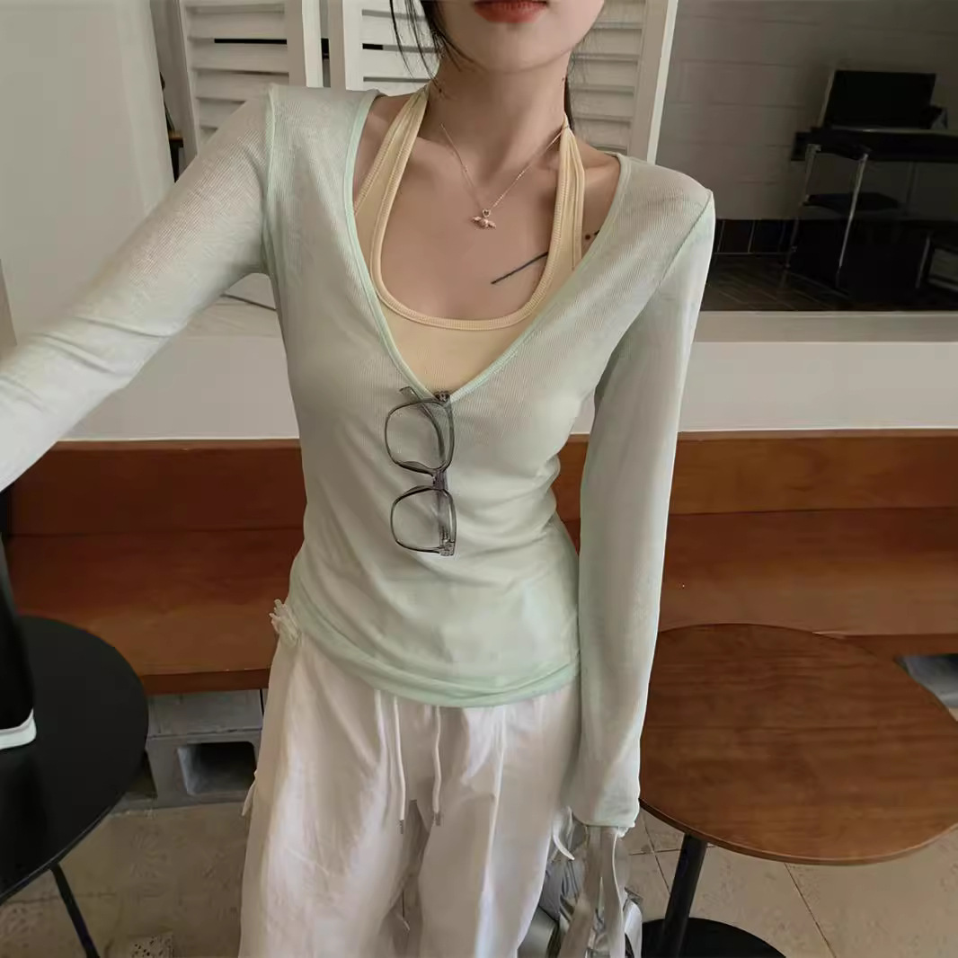 春秋季新款叠穿防晒罩衫T恤两件套纯欲风露背显瘦挂脖背心套装女