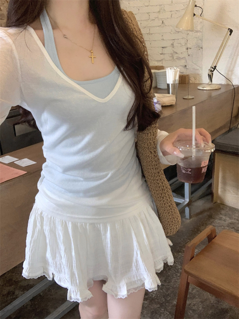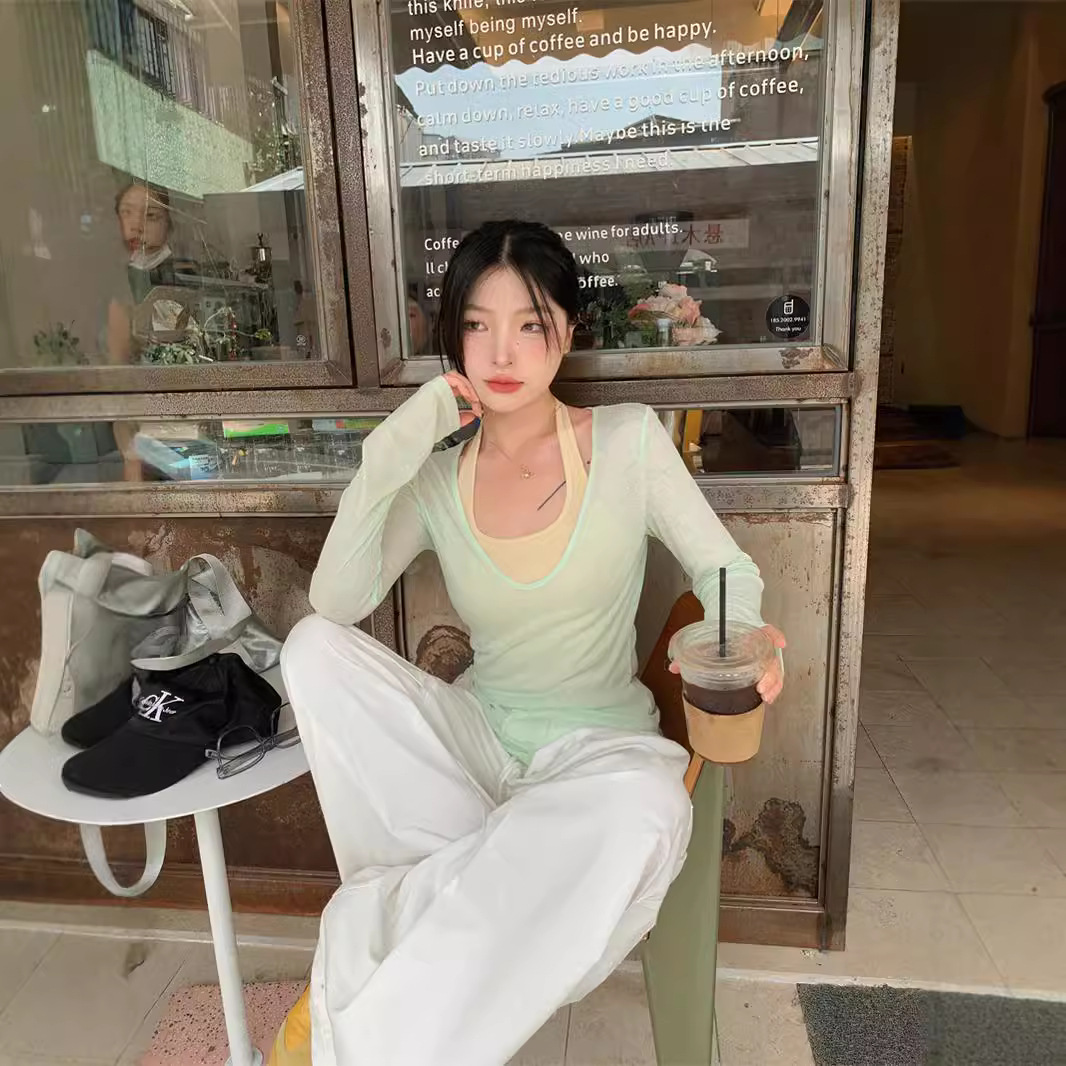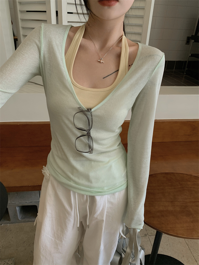 春秋季新款叠穿防晒罩衫T恤两件套纯欲风露背显瘦挂脖背心套装女