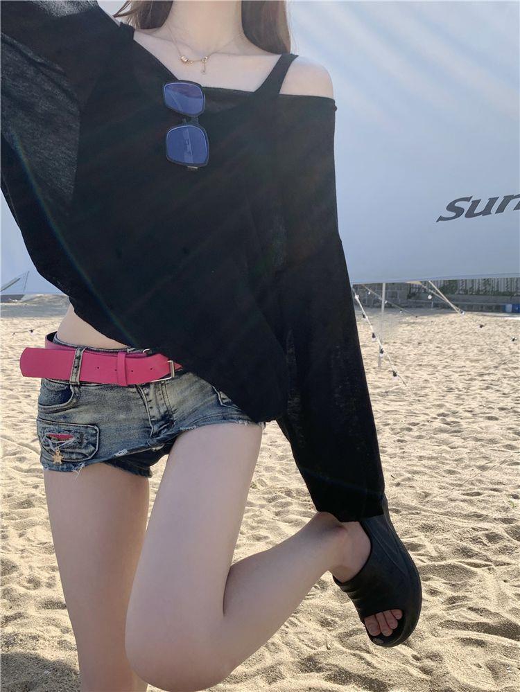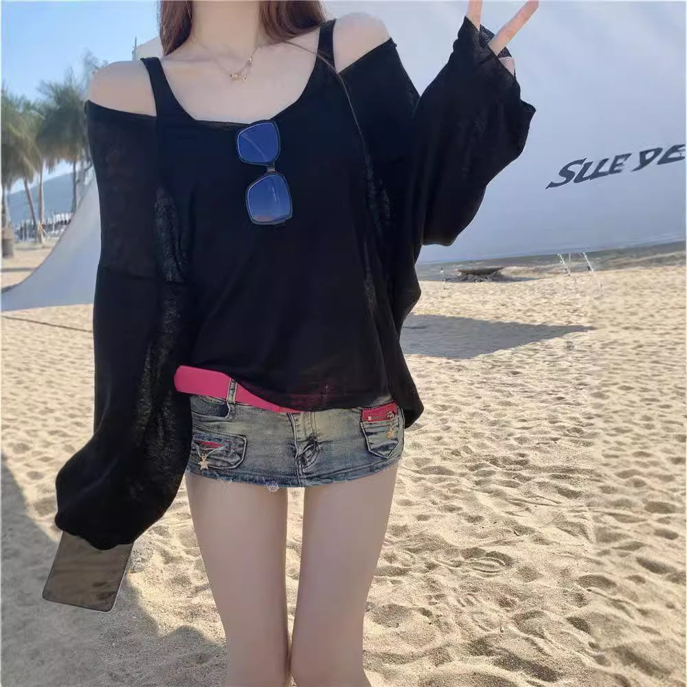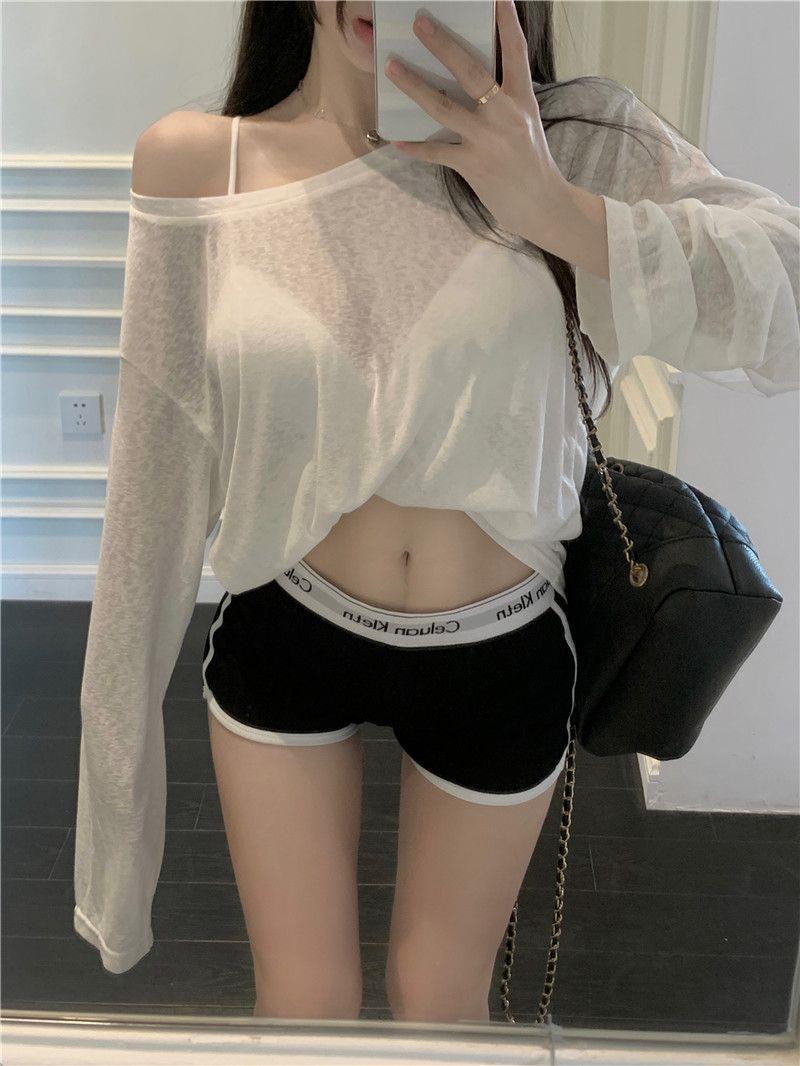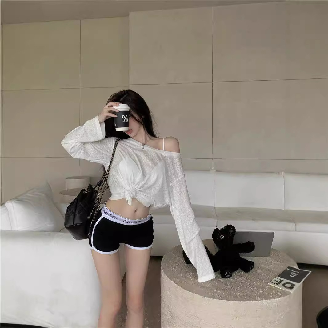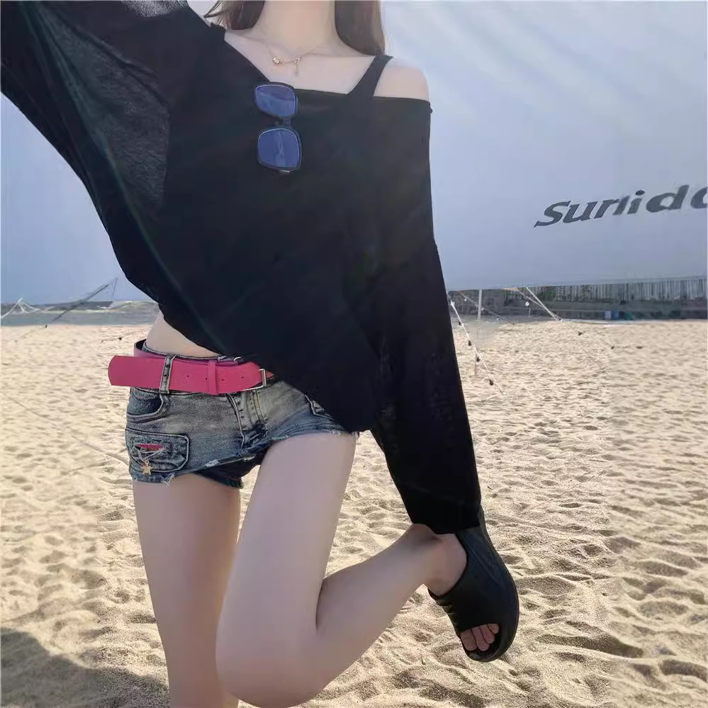 纯欲白色薄款长袖T恤女春装一字肩宽松休闲防晒罩衫外套慵懒上衣