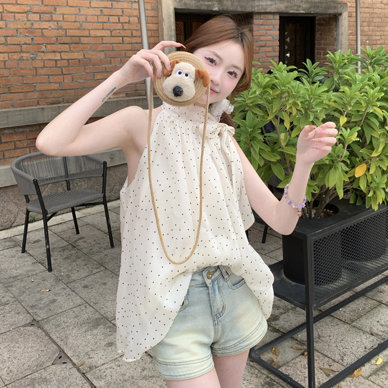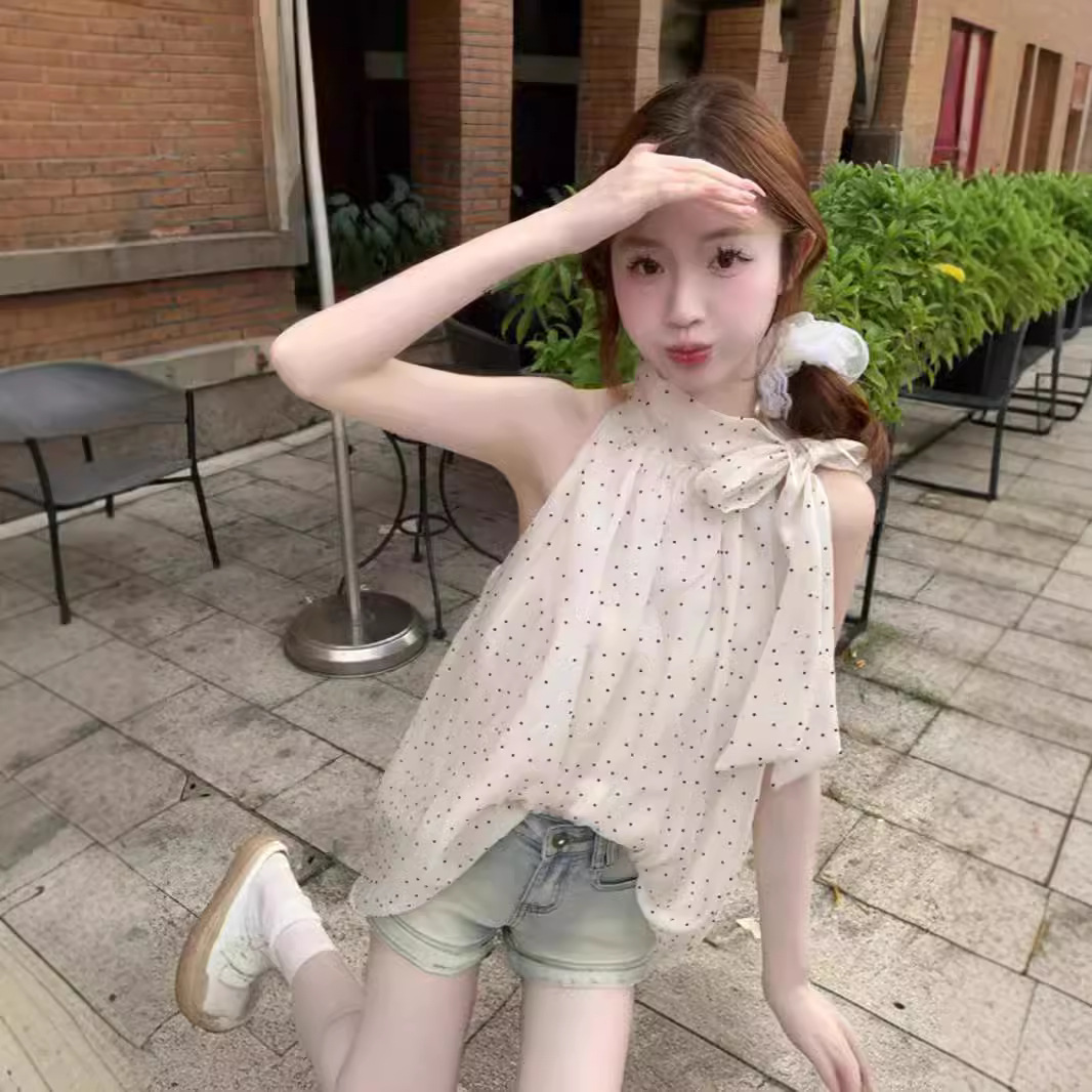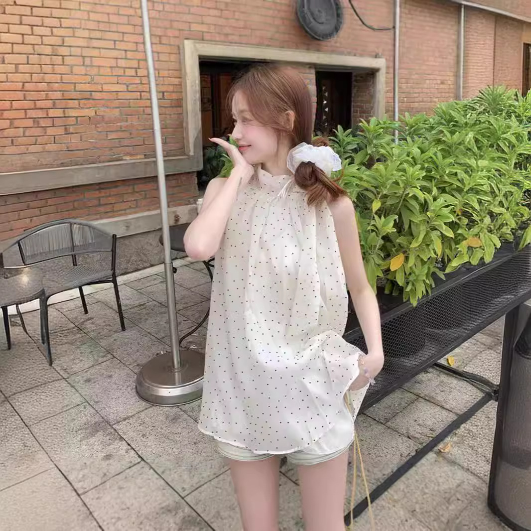 波点挂脖无袖衬衫女夏季2025新款韩系宽松休闲减龄设计感系带上衣