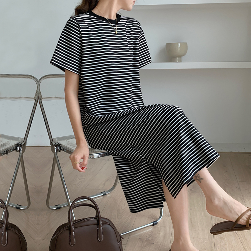 【价值高于价格】开衩黑白条纹连衣裙女宽松百搭短袖过膝裙长裙子
