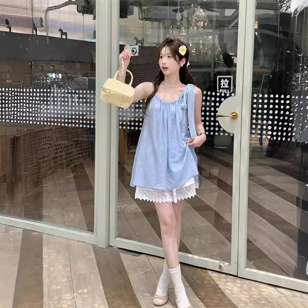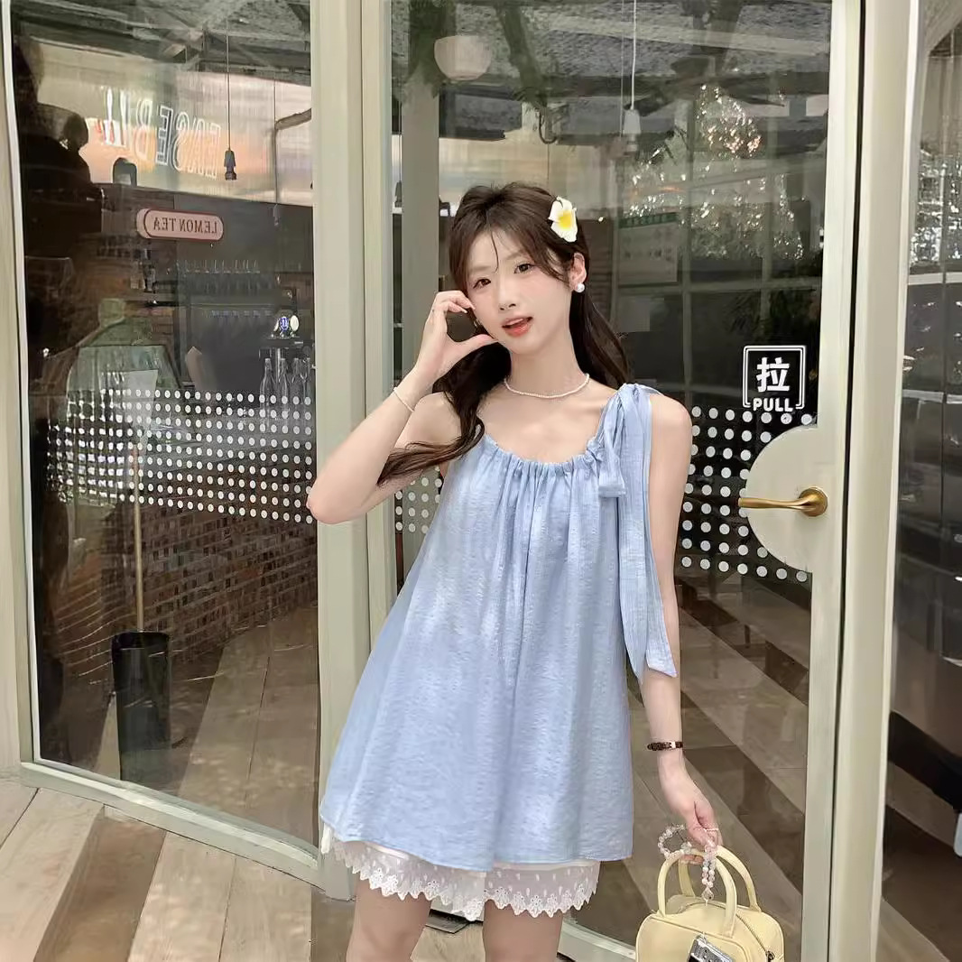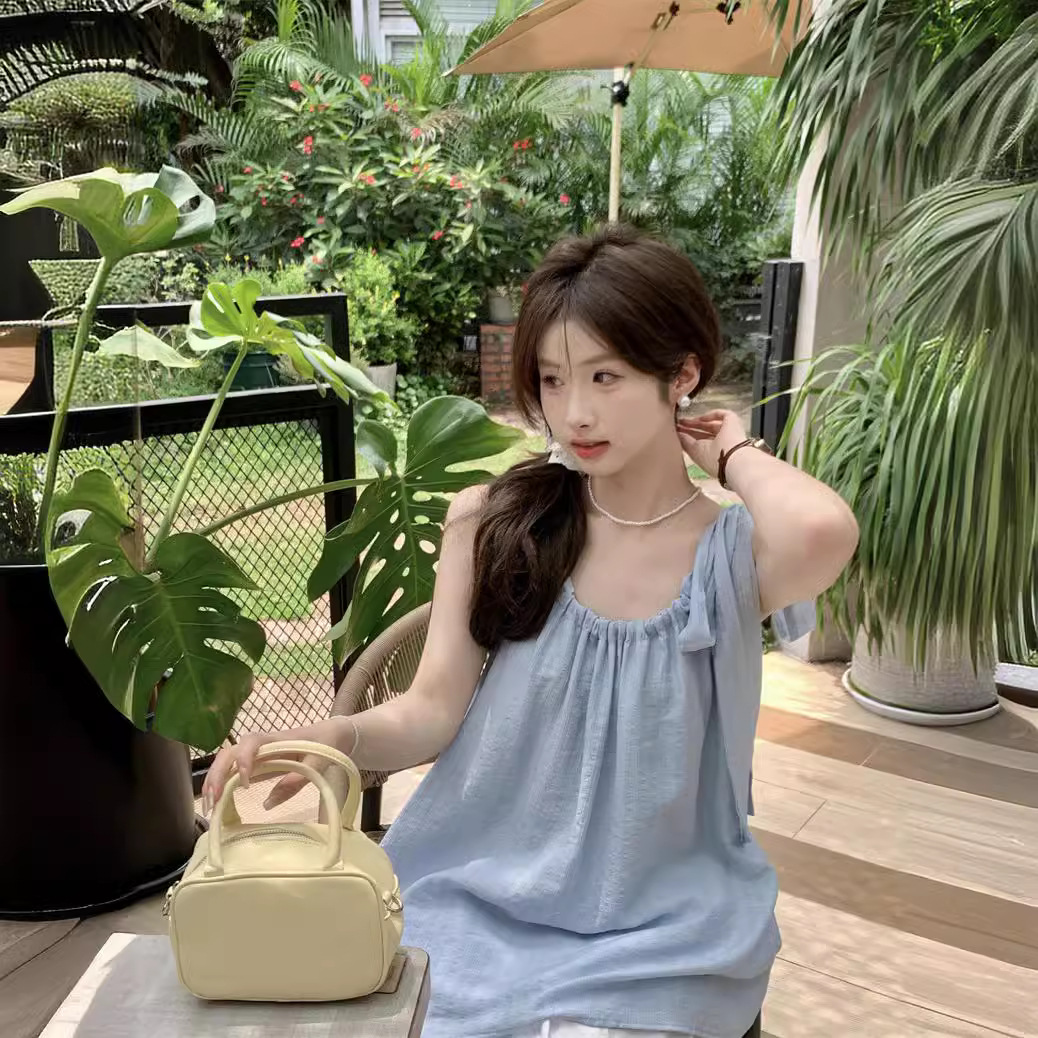 甜美风奶蓝色蝴蝶结绑带小背心女装夏季减龄宽松找出了吊带上衣
