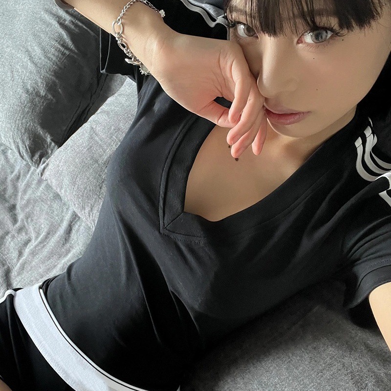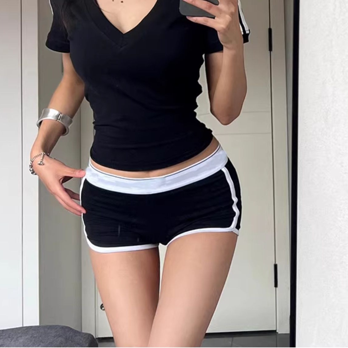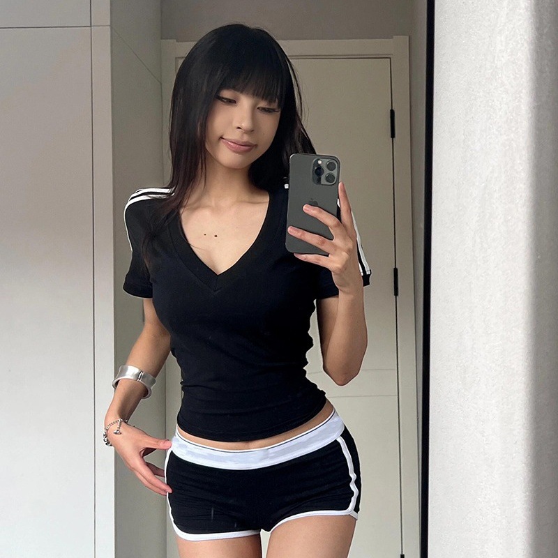 复古辣妹黑色V领T恤女2025新款夏季甜辣风修身显瘦百搭上衣欧货潮
