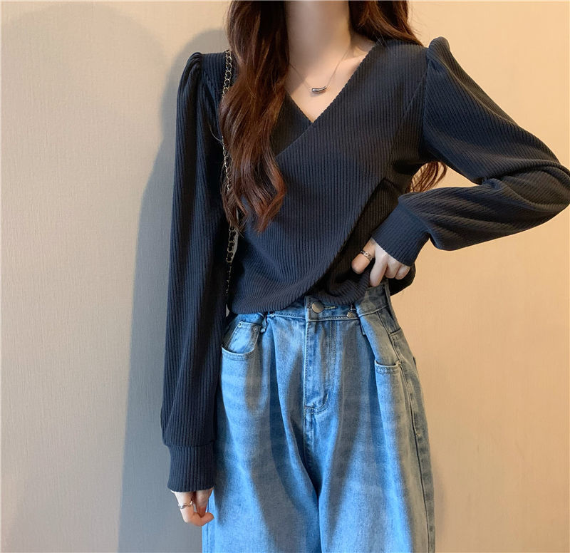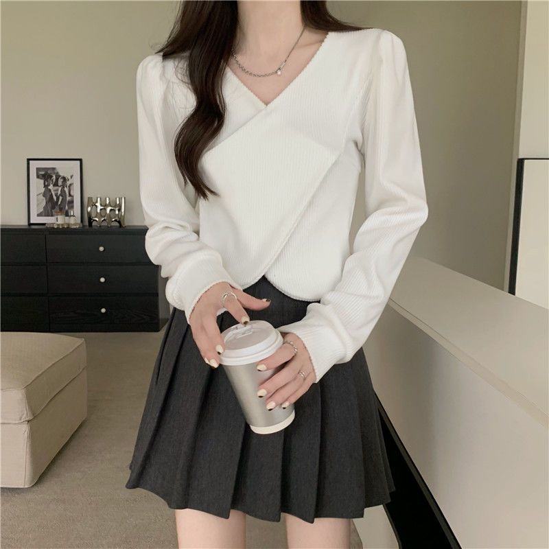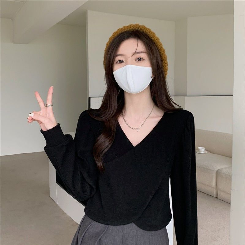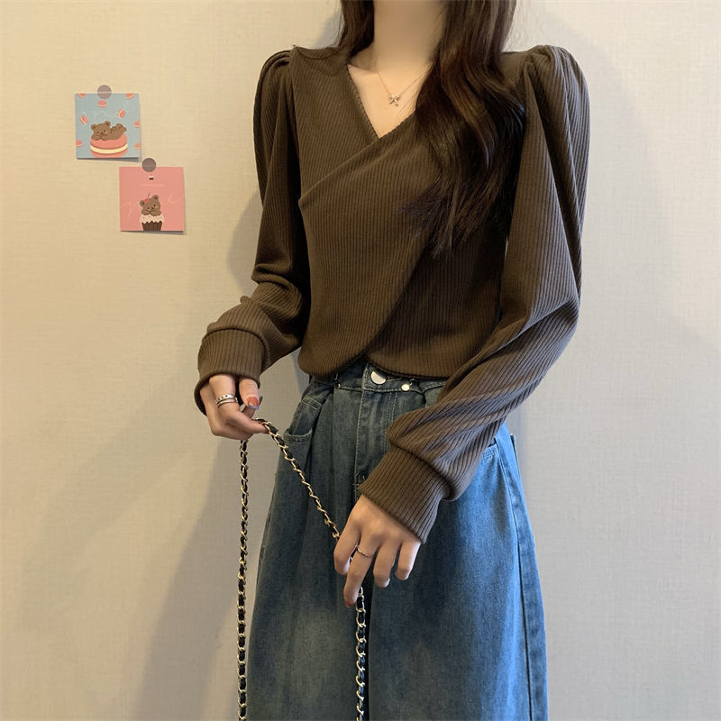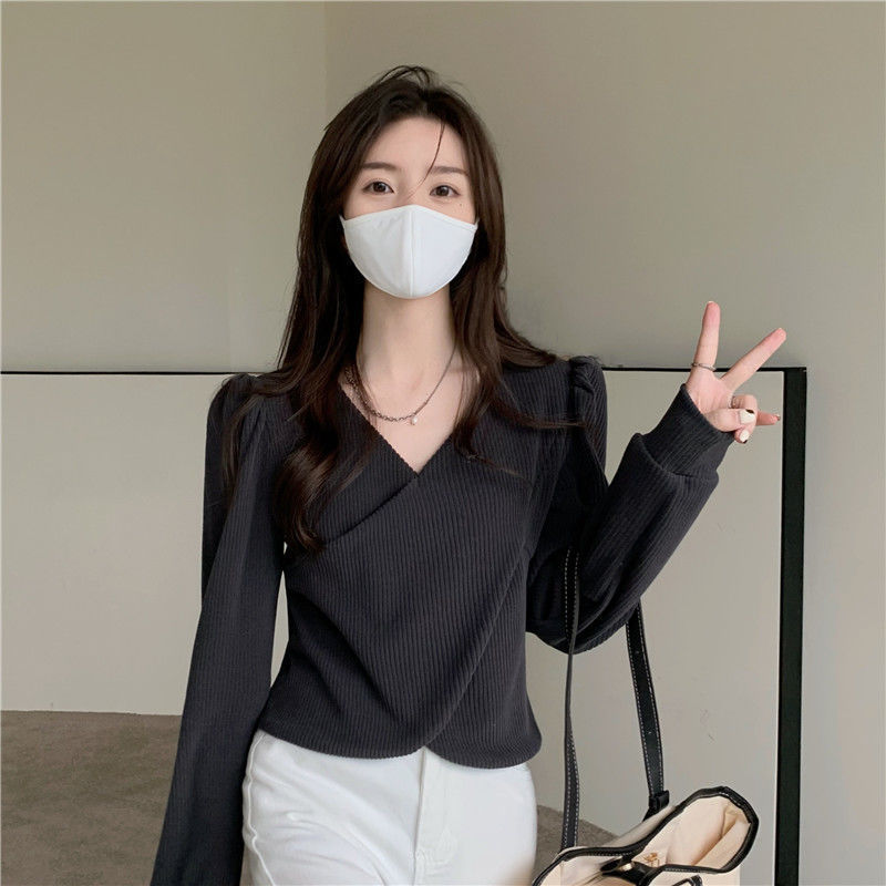 秋冬交叉v领设计感正肩T恤女长袖内搭不规则短款泡泡袖上衣打底衫