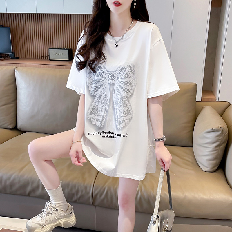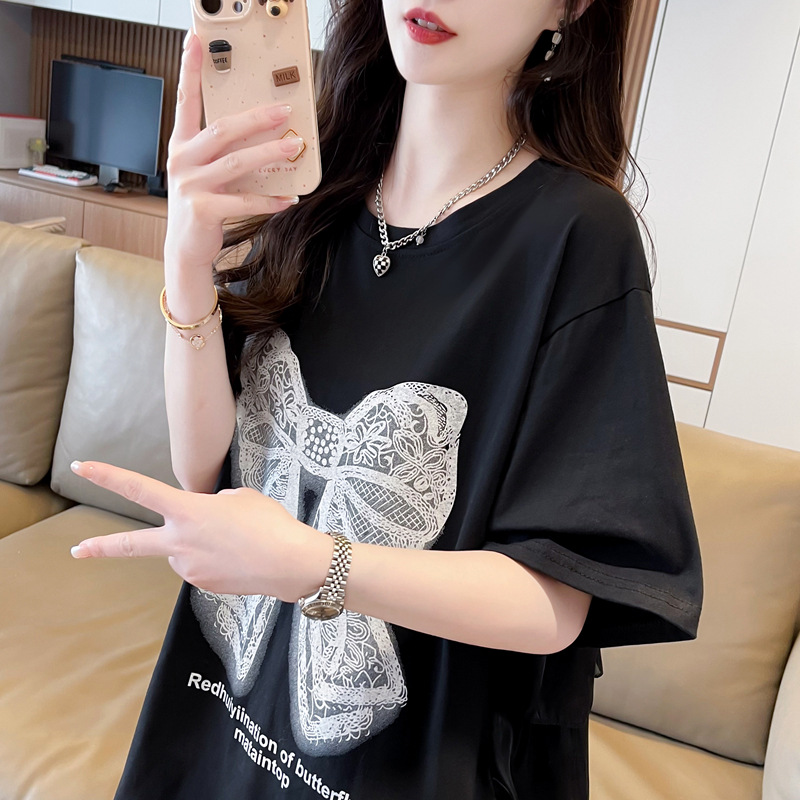 大码正肩蝴蝶结印花短袖t恤夏季新款韩版设计感休闲宽松半袖上衣c