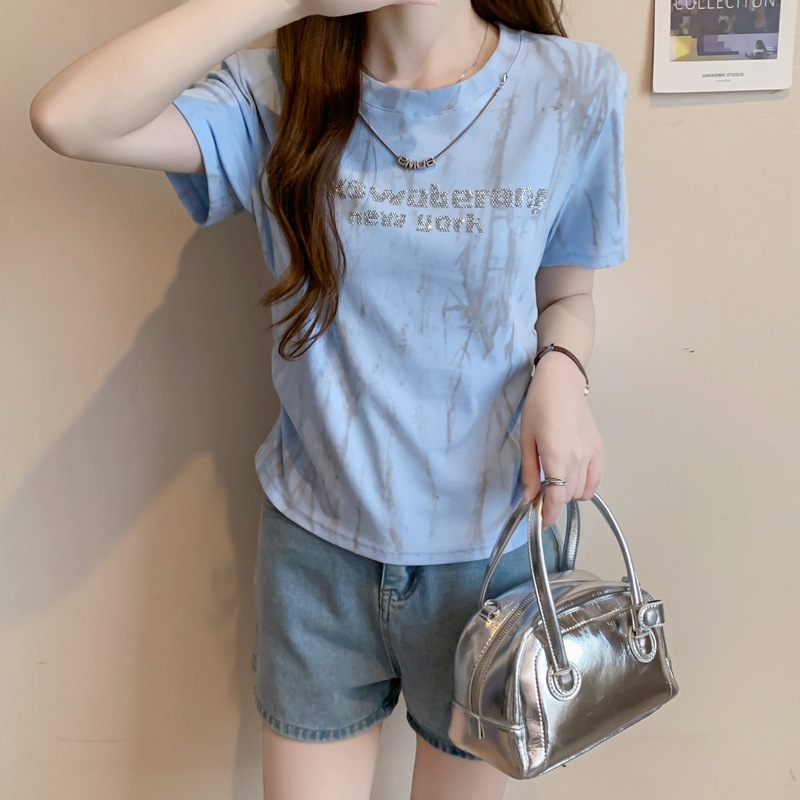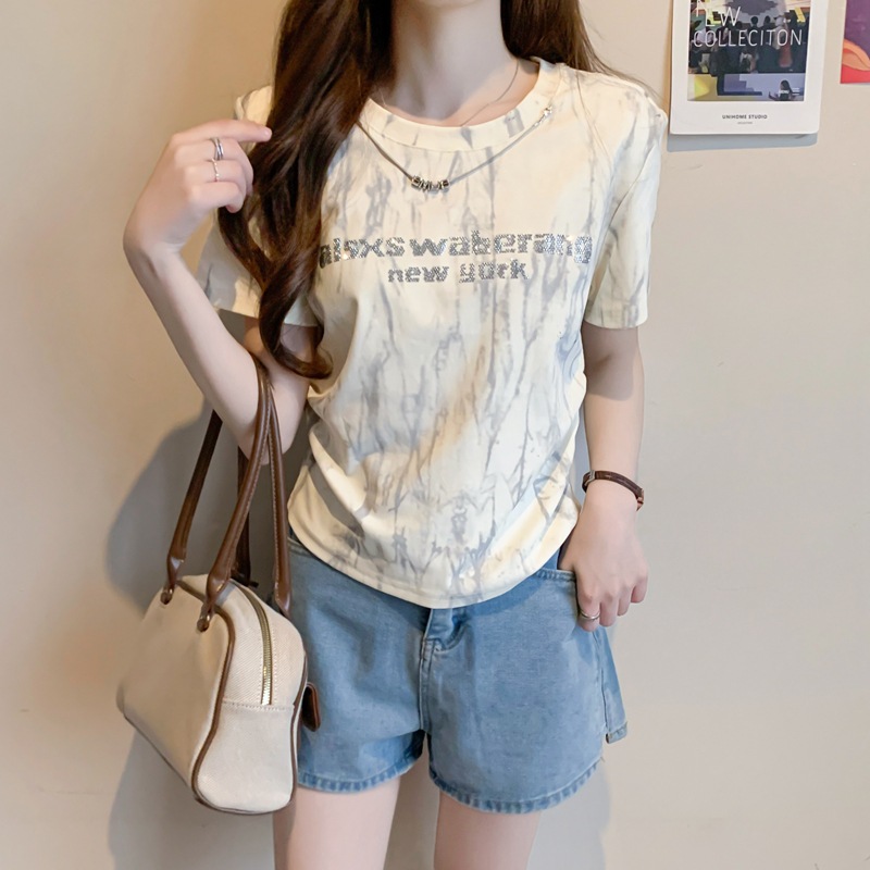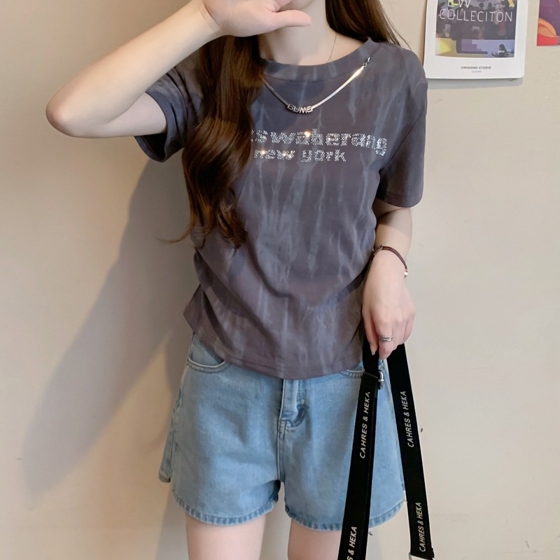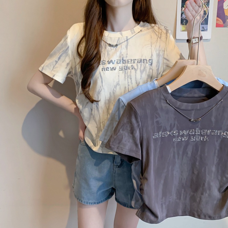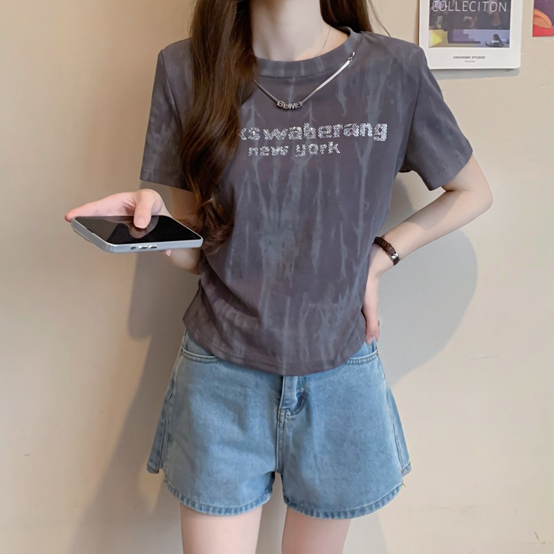 纯棉螺纹短袖t恤女2025新款潮印花正肩修身短款圆领上衣韩版女装
