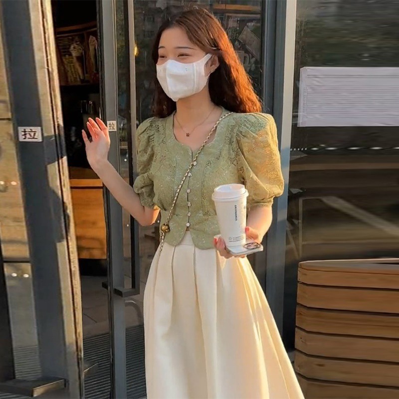夏季新款轻熟风港味复古绿色小个子泡泡袖上衣半身裙两件套装