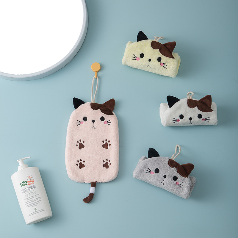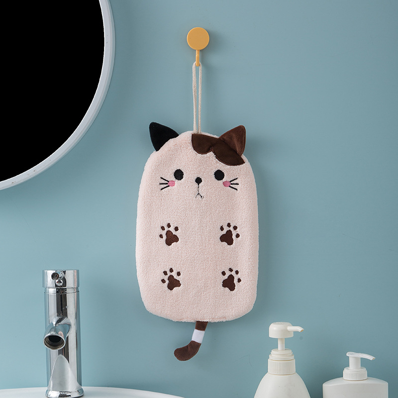 珊瑚绒平面猫咪绣花擦手巾浴室挂式吸水毛巾厨房浴室两用方巾