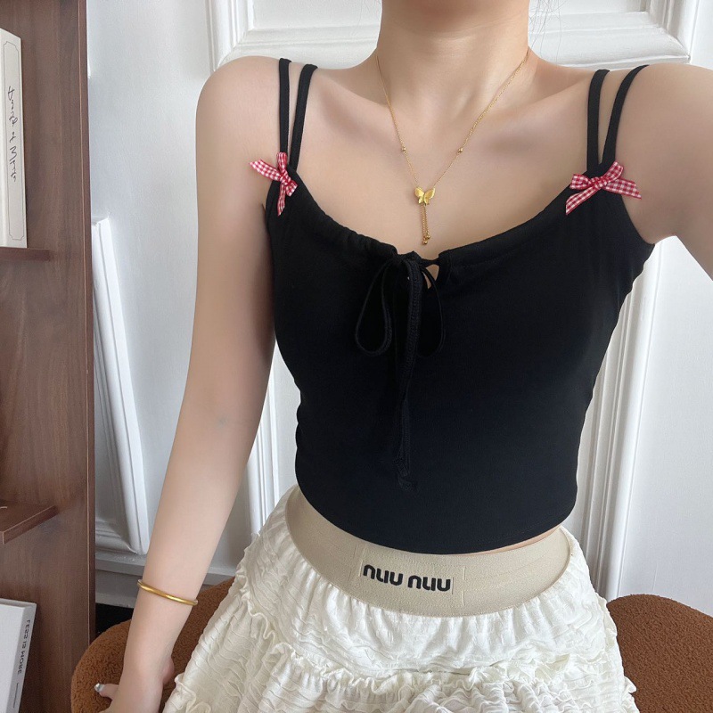 夏秋季新款奶黄色纯欲甜辣风吊带小背心女新款氛围感蝴蝶结上衣