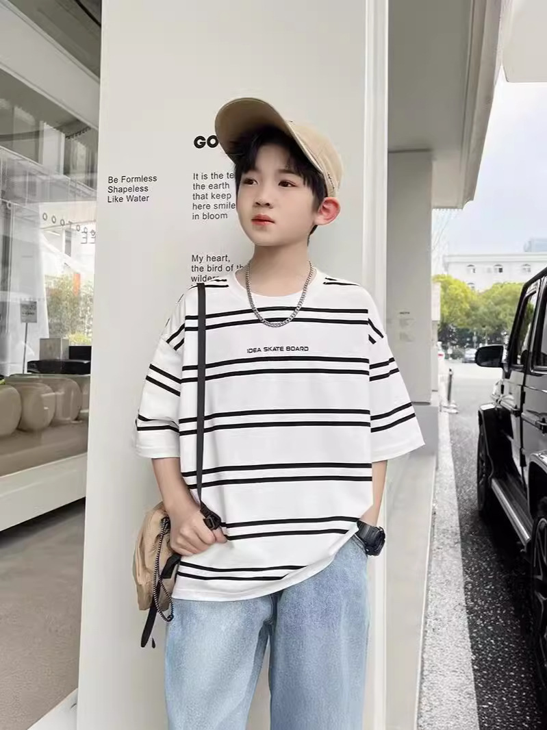 童装夏季条纹短袖t恤男童炸街半袖学生运动体恤五分袖潮牌流上衣