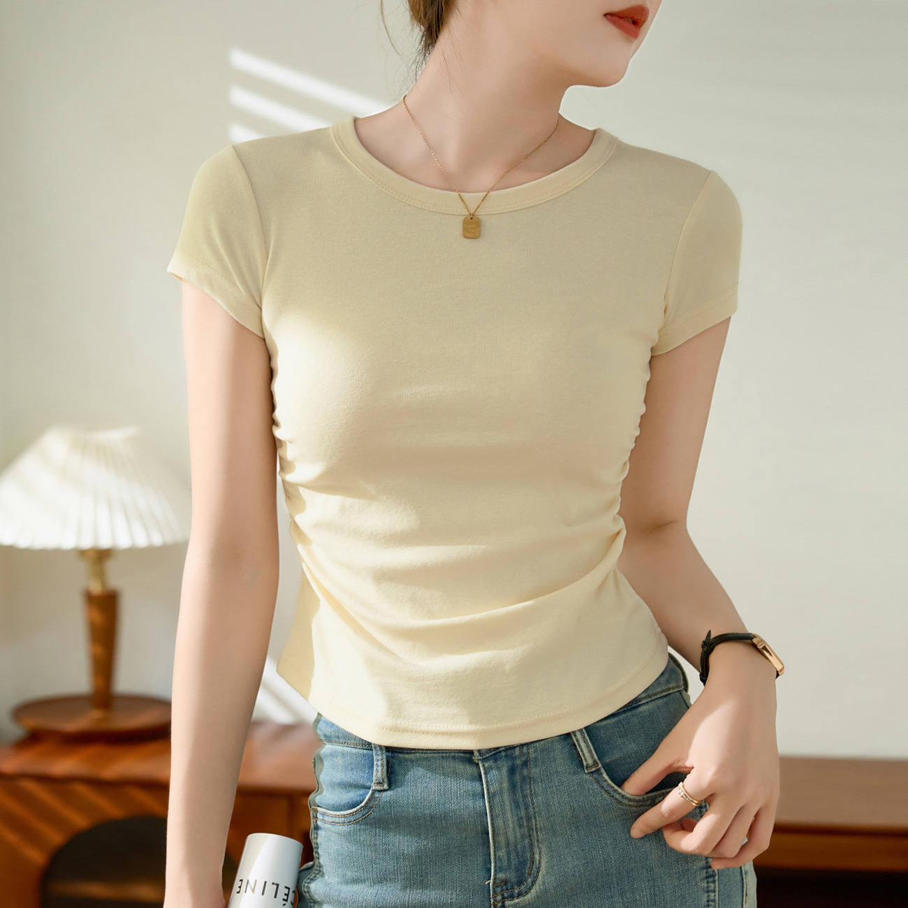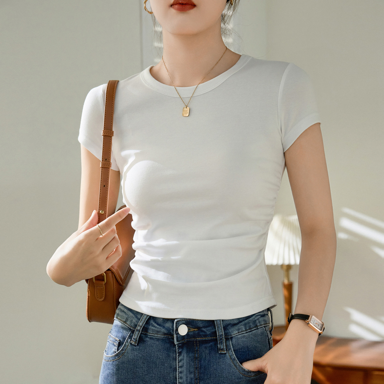 【甄选棉】抽褶束腰纯棉T恤女夏短袖2025新款收腰短款显瘦打底衫