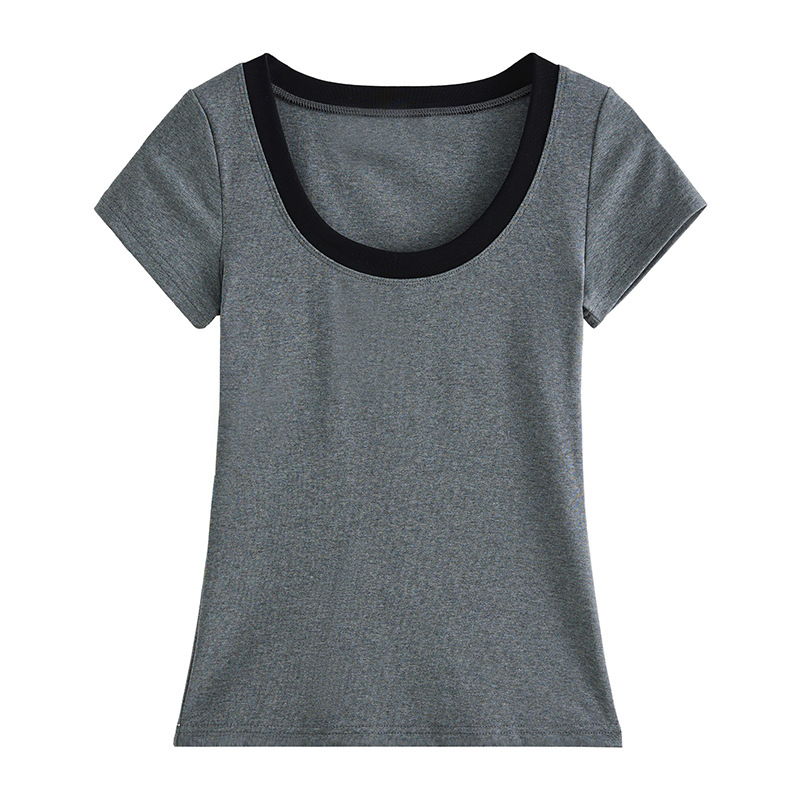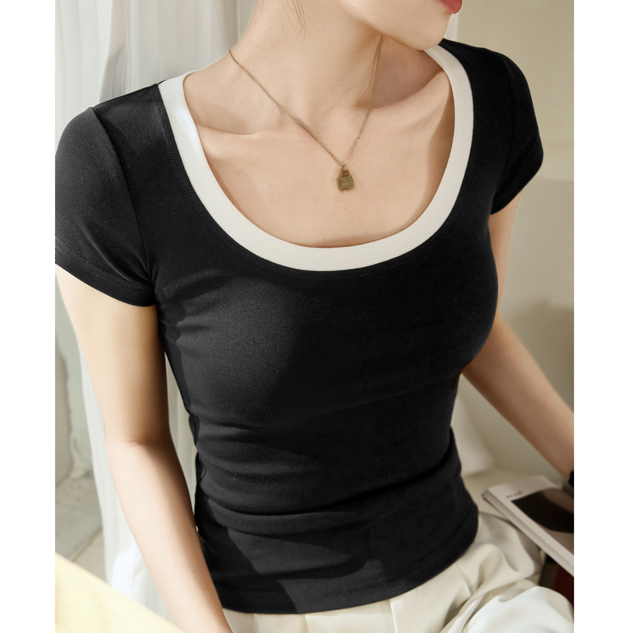 【精梳棉】撞色大U领纯棉T恤女夏性感2025新款短袖显瘦上衣打底衫