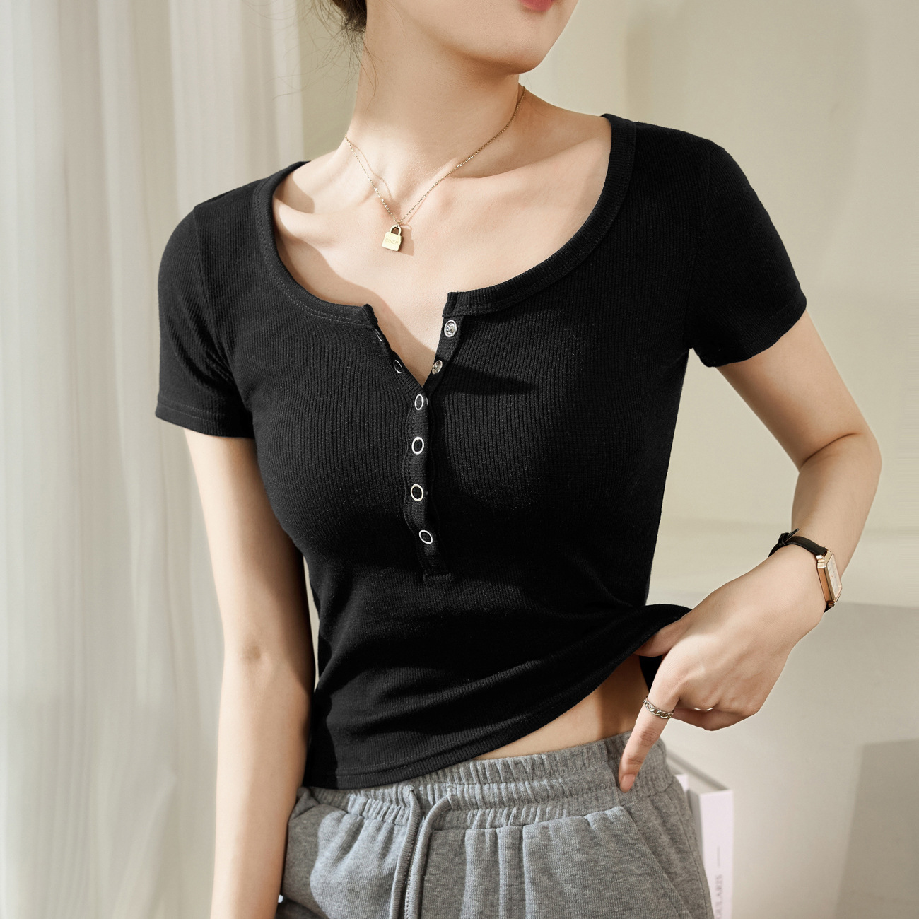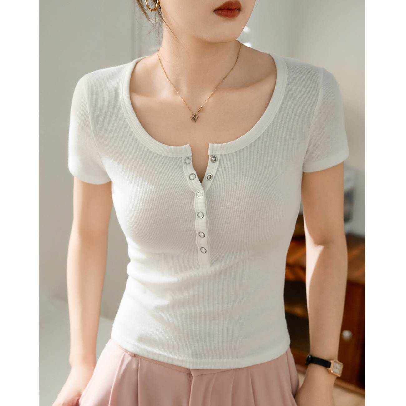 用好料%高级感暗扣短袖T恤女夏螺纹棉2025新款修身显瘦百搭打底衫