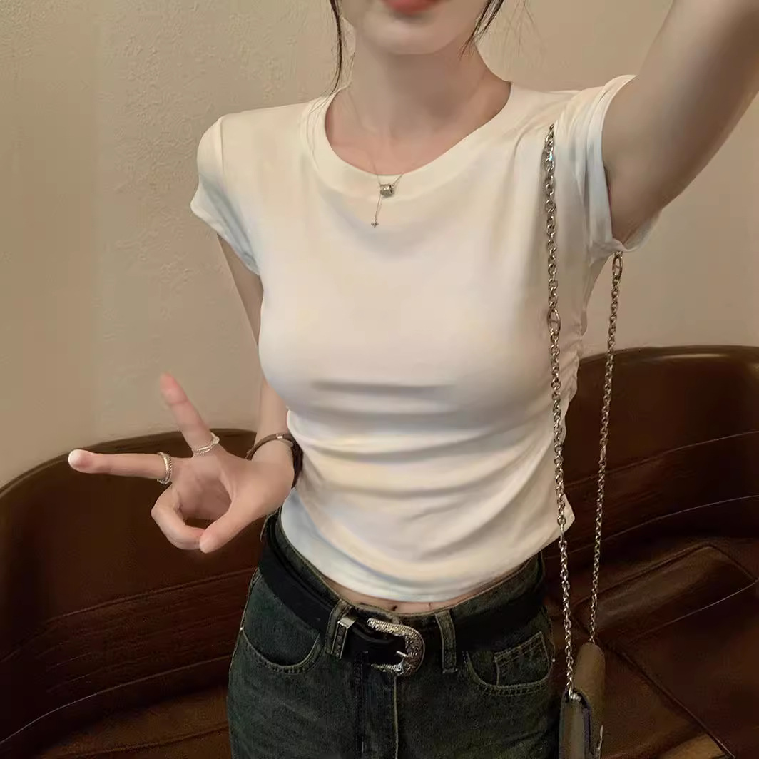 纯棉正肩圆领短袖t恤女夏季新款修身显瘦叠穿基础款打底上衣