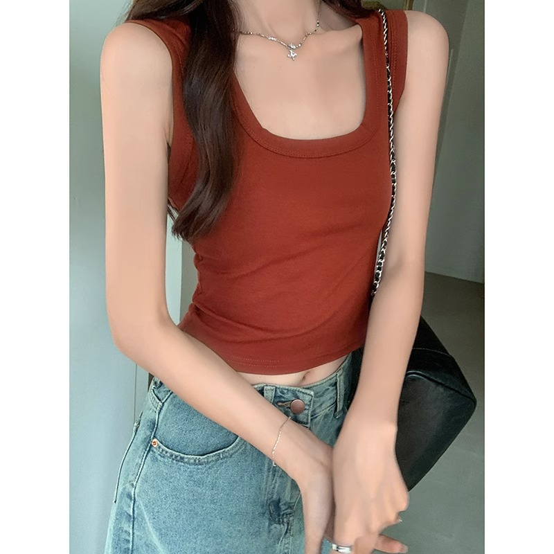 法式复古简约休闲百搭纯色无袖上衣U领显白甜美夏季小背心女