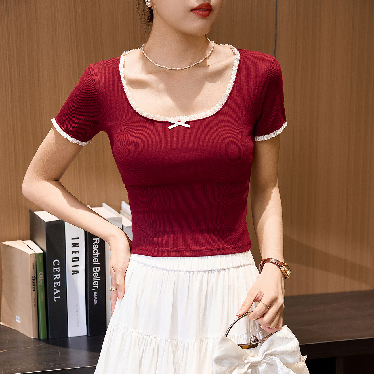 #天丝优可 用好料 甄品质#花边T恤女夏新款U领蝴蝶结短袖撞色上衣