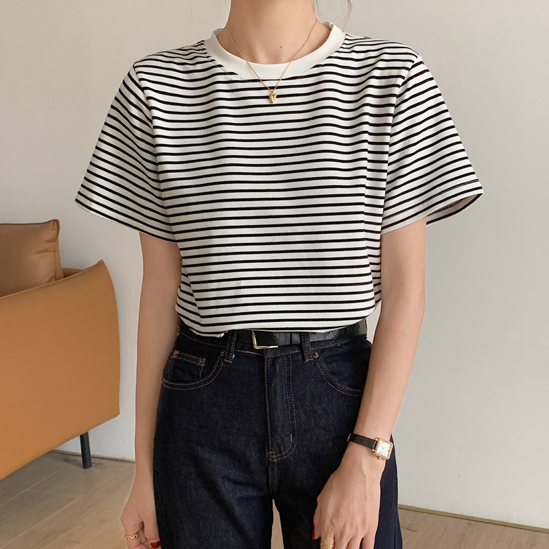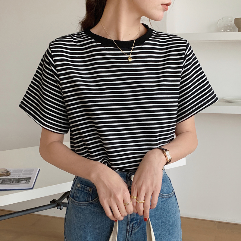 优质纯棉条纹T恤打底衫女短袖2025夏季新款宽松显瘦百搭圆领上衣