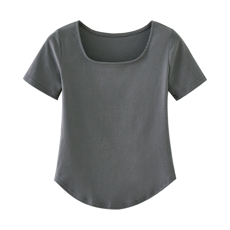 高级感全棉T恤女夏短袖2025新款不规则弧形修身显瘦方领打底上衣