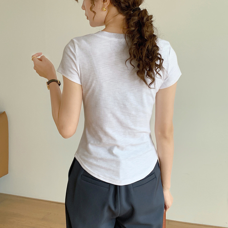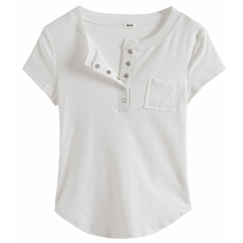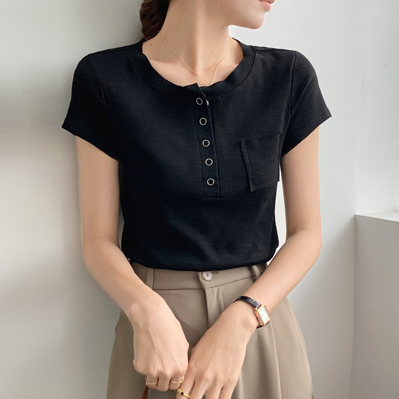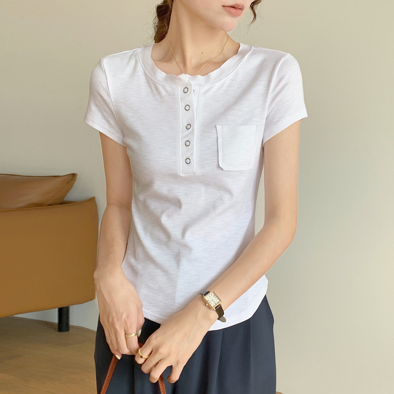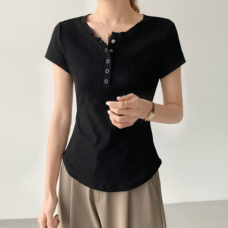 竹节棉短袖t恤女上衣2025夏季新款女装打底衫纽扣纯色修身小衫潮