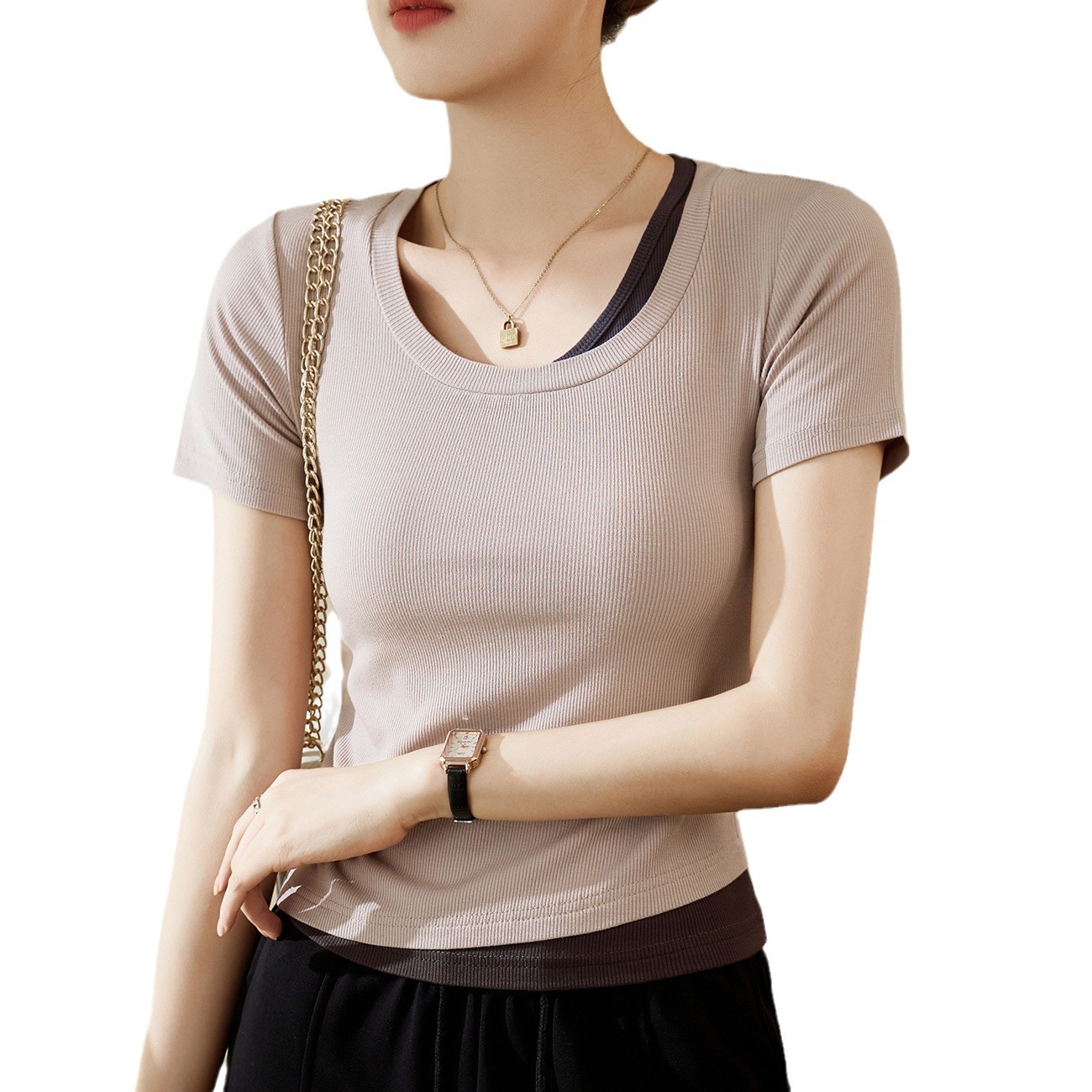 【甄选好料】拼接撞色假两件T恤女短袖2025夏新款修身显瘦打底衫