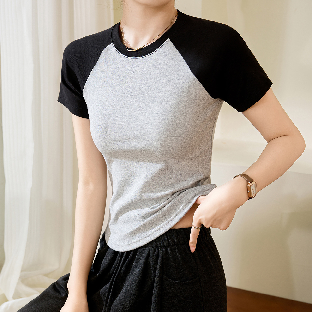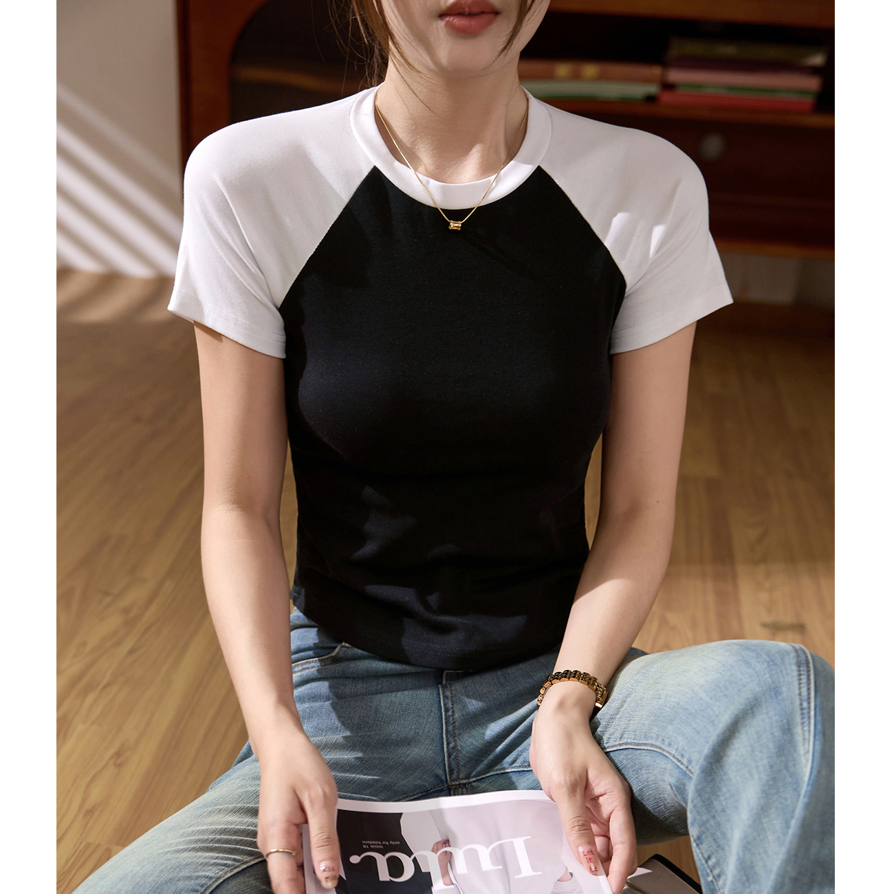 【撞色不染色】纯棉弧形短袖T恤女夏2025新款修身显瘦上衣打底衫