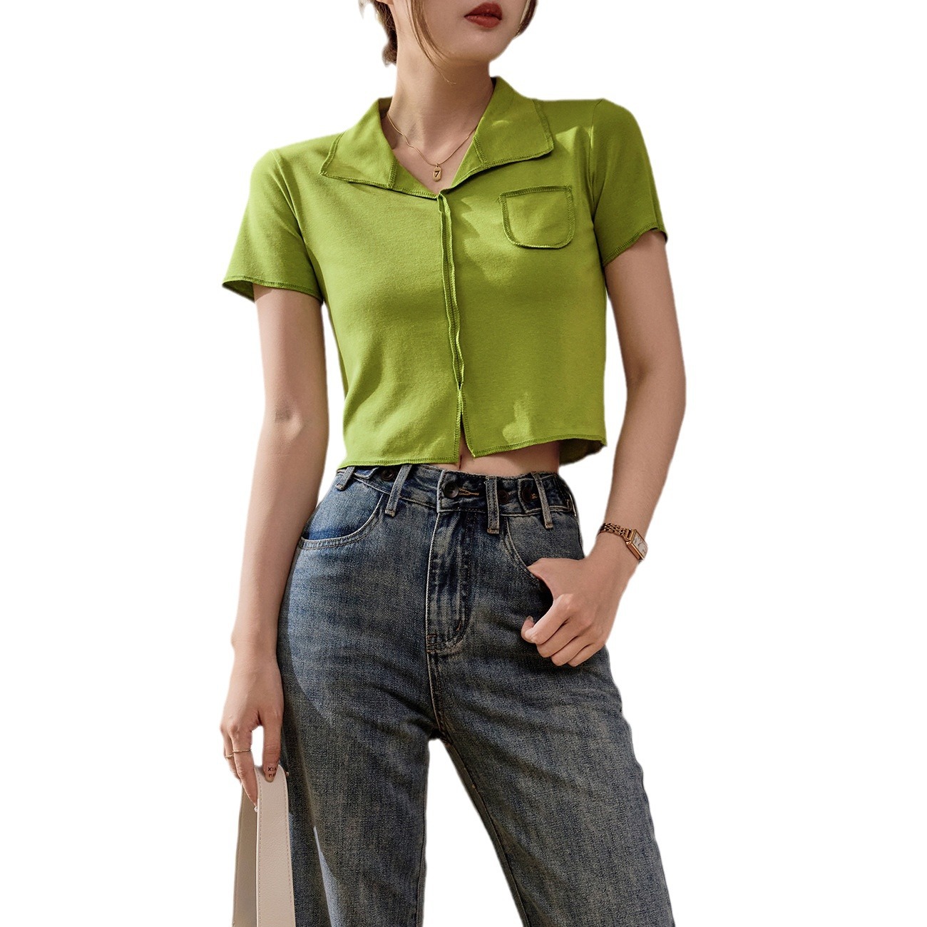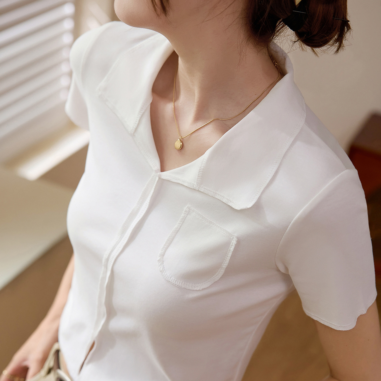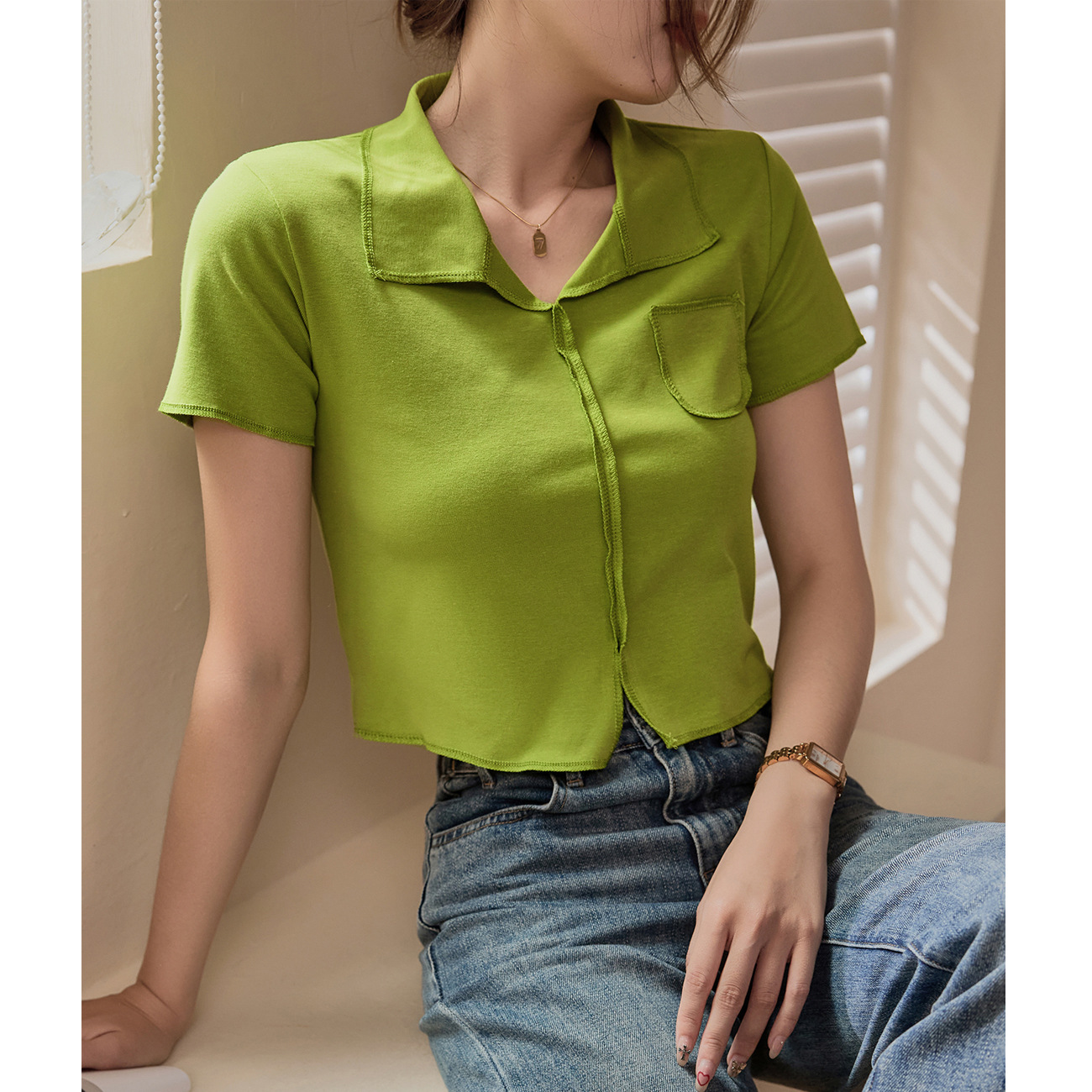 #甄选纯棉#明线设计感高级T恤女夏2025新款高腰短款翻领短袖上衣