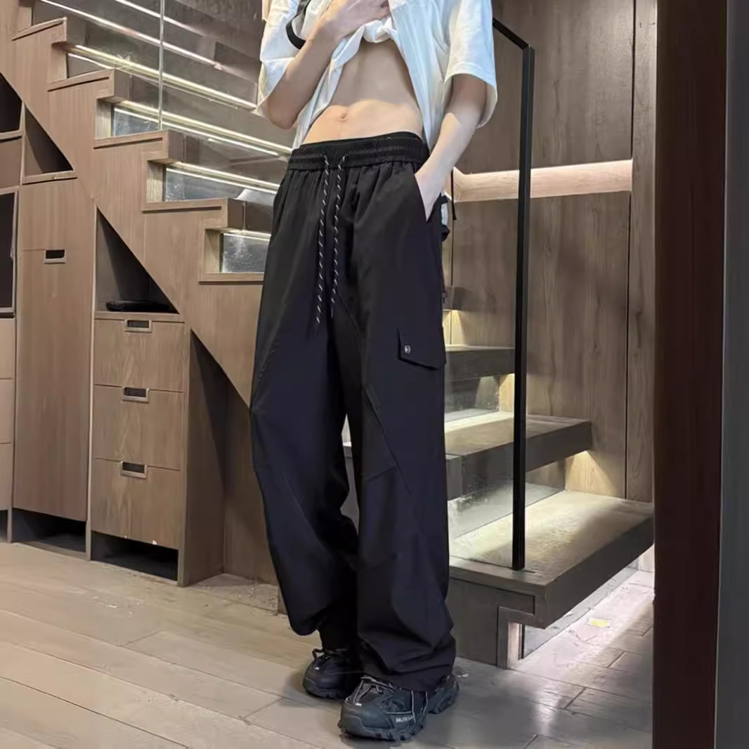 黑色防水冲锋裤子男生夏季新款运动长裤宽松时尚纯色休闲直筒长裤