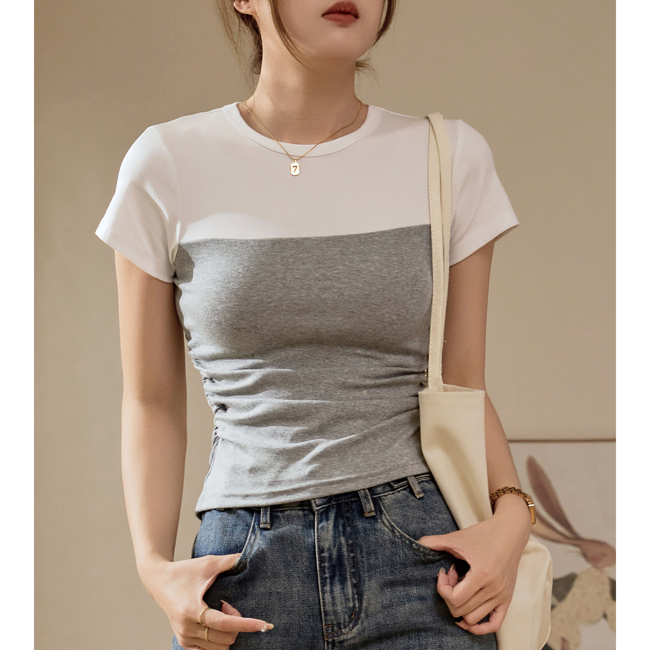 【甄选纯棉】撞色拼接T恤女2025夏新款修身显瘦正肩打底短袖上衣