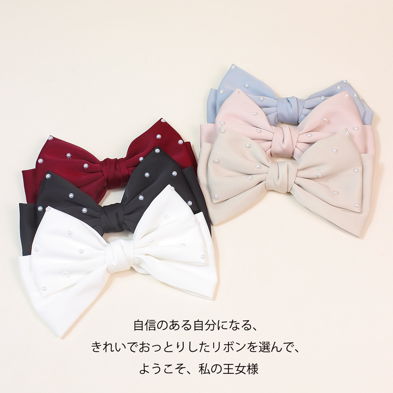 亚马逊手工新款大蝴蝶结弹簧夹高级缎面珍珠头饰气质百搭发夹发饰