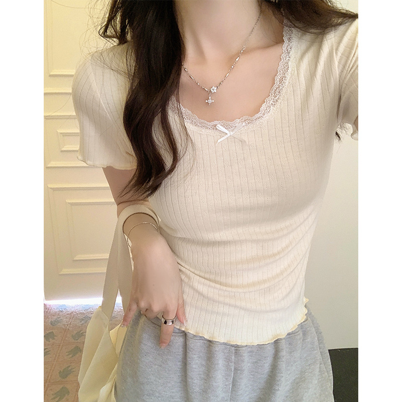 芭蕾风纯欲蕾丝花边U领T恤女2025夏季新款复古短袖卷边打底衫上衣