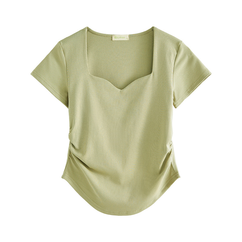 #精梳纯棉# 桃心方领短袖T恤女2025夏新款褶皱修身正肩上衣打底衫