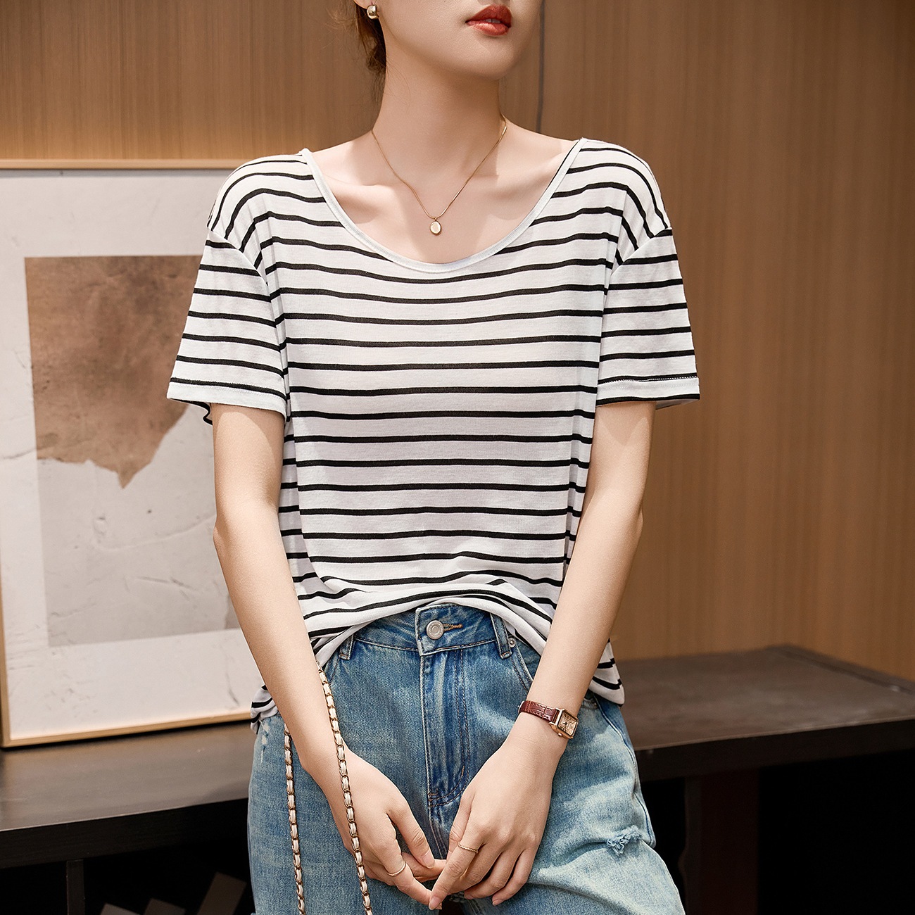 #天丝羊毛 裸感炒薄 亲肤冰爽# 宽松T恤女夏短袖黑白条纹上衣外穿
