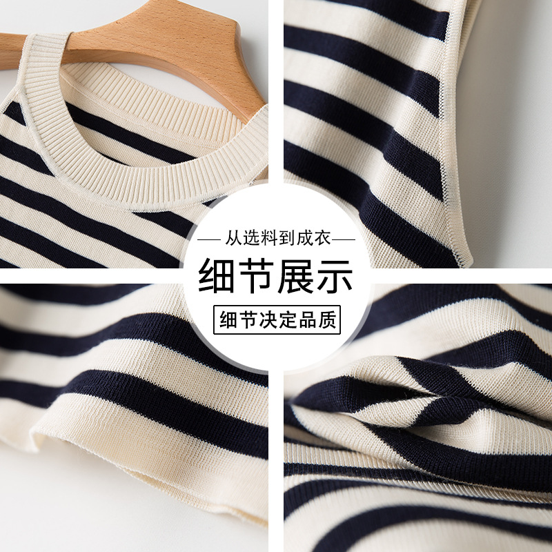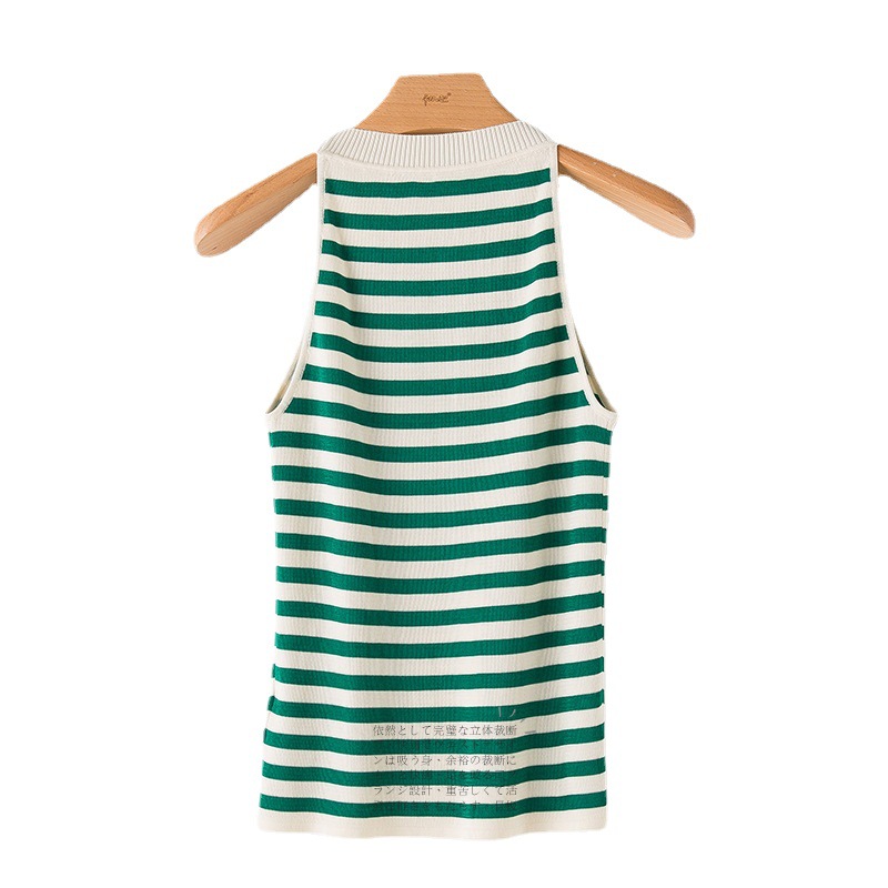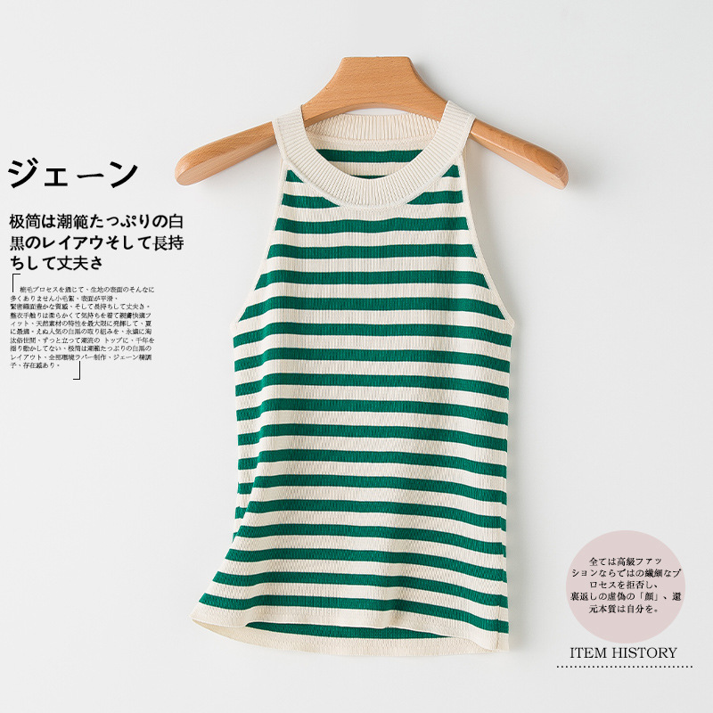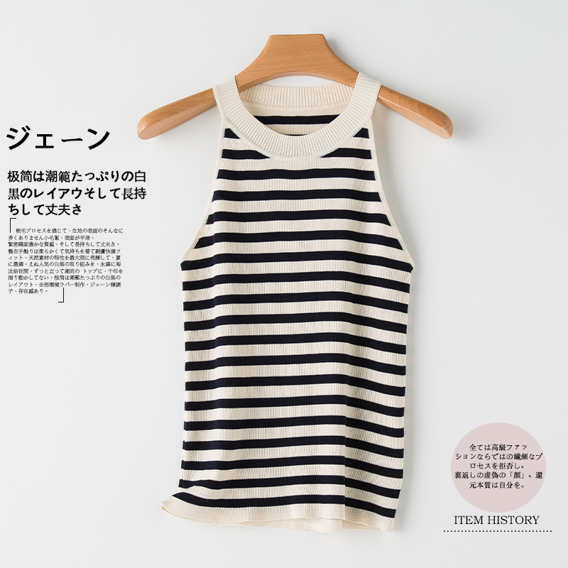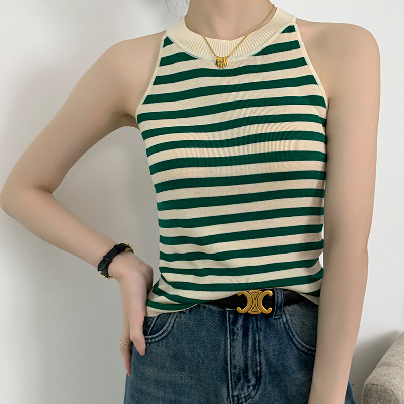春夏薄款天丝条纹撞色无袖冰感凉爽圆领挂脖背心上衣女