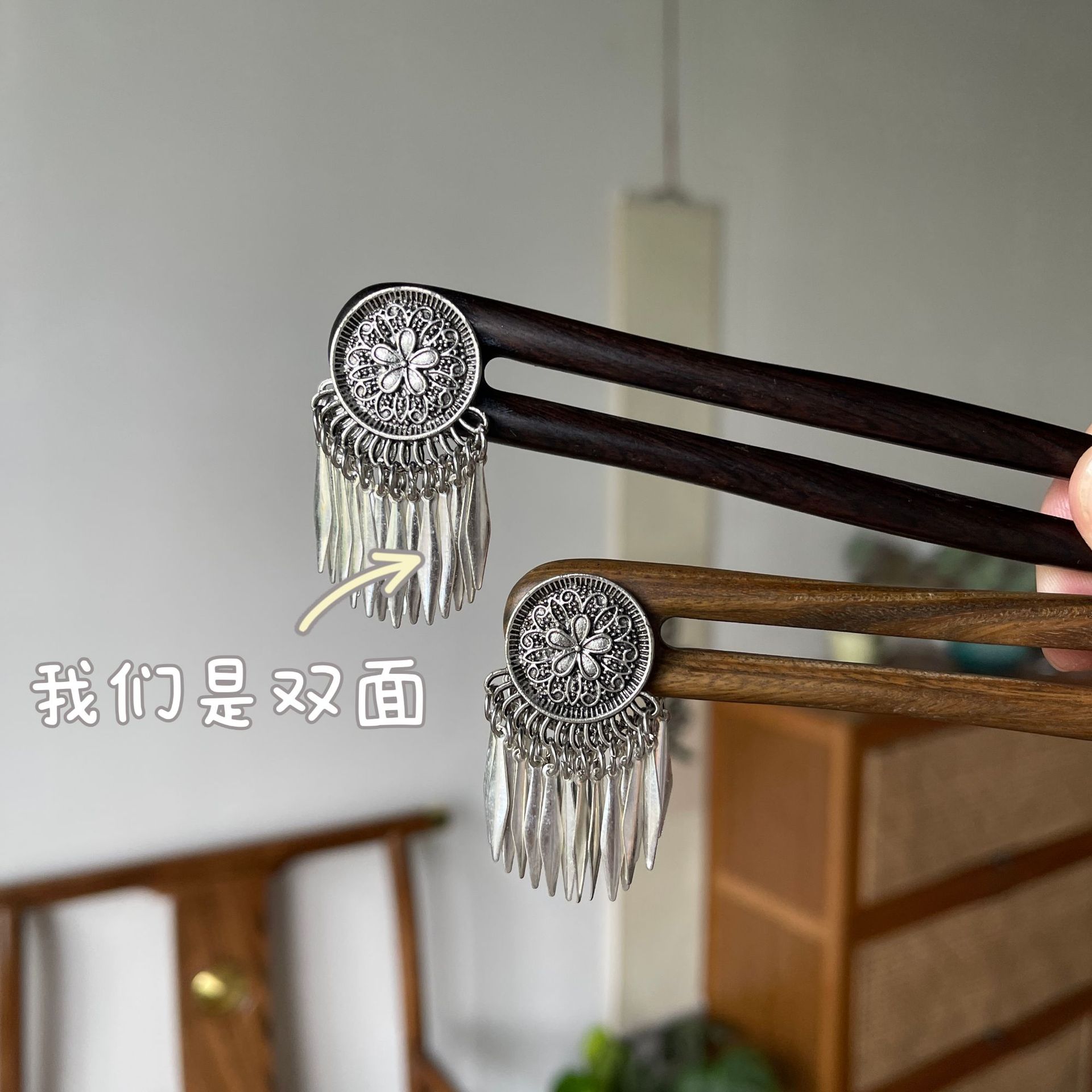 古风双面U型黑檀木发簪流苏步摇绿檀簪子头饰盘发汉服古装木发钗